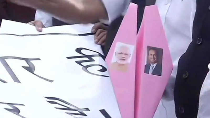 நாடாளுமன்ற வளாகத்தில் காகித விமானத்துடன் காங்கிரஸ் கட்சித் தலைவர் ராகுல்போராட்டத்தில் ஈடுபட்டுள்ளார்.போராட்டத்தில் ஈடுபட்டிருப்பவர்கள் காகித விமானங்களை கையில் வைத்துக் கொண்டு, பாஜக அரசுக்கு எதிராக கோஷங்களை எழுப்பினர்.
