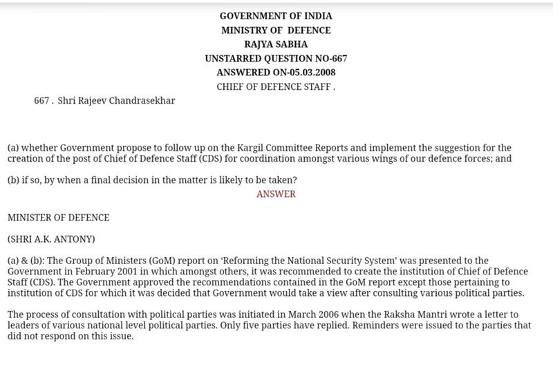 மத்திய அரசு இந்த முடிவை தற்போது எடுத்திருந்தாலும் முப்படைகளுக்கும் ஒரே தலைவரை நியமிக்க வேண்டும் என பாஜக மாநிலங்கவை உறுப்பினர் ராஜீவ் சந்திரசேகர் கடந்த 2008 ஆம் ஆண்டு முதல் வலியுறுத்தி வருகிறார்.