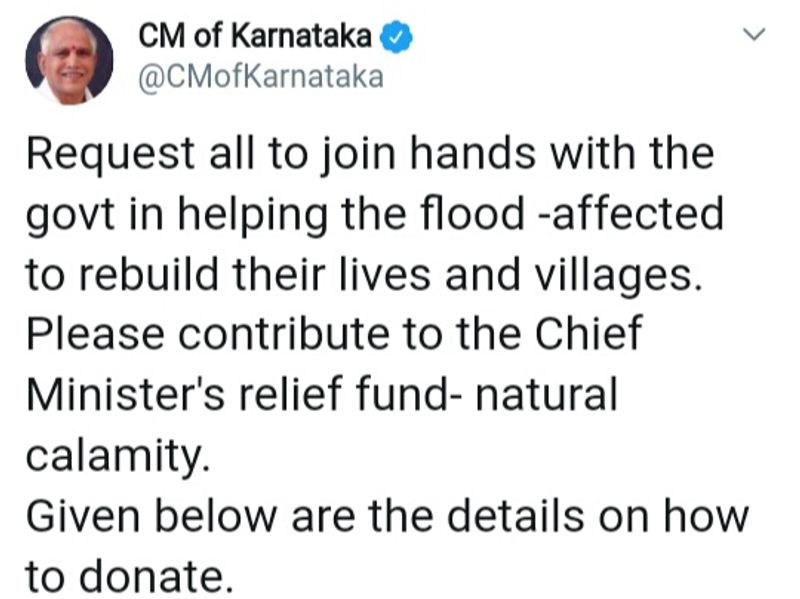 இந்த கனமழை வெள்ளத்தால் குடகு உள்ளிட்ட மலை மாவட்டங்கள் கடுமையாக பாதிக்கப்பட்டுள்ளன. நிலச்சரிவு, வெள்ளப் பெருக்கு போன்றவைகளால் 54 பேருக்கு மேல் உயிரிழந்துள்ளனர். இதனிடையே கடும் பேரழிவால் பாதிக்கப்பட்டுள்ள கர்நாக மாநில மக்களுக்கு உதவும் வகையில் முதலமைச்சர் நிவாரண நிதிக்கு நிதி கொடுத்து உதவ வேண்டும் என முதலமைச்சர் எடியூரப்பா கேட்டுக் கொண்டுள்ளார்.