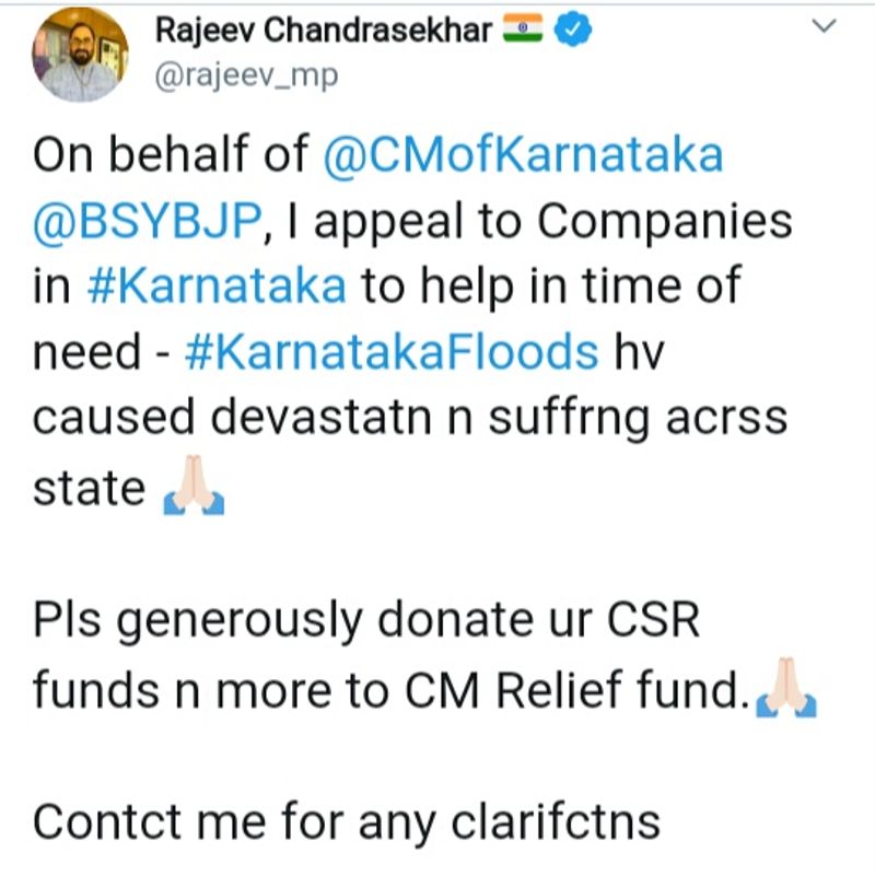 ர்நாடகா மாநிலம் முழுவதும் கடும் வெள்ளத்தால் பாதிக்கப்பட்ட மக்களுக்கு உதவும் வகையில் அம்மாநிலத்தில் உள்ள நிறுவனங்கள் உதவி செய்திட வேண்டும் என முதலமைச்சர் எடியூரப்பா சார்பில் கேட்டுக் கொள்வதாக பாஜக எம்.பி.ராஜீவ் சந்திரசேகர் கேட்டுக் கொண்டுள்ளார்.