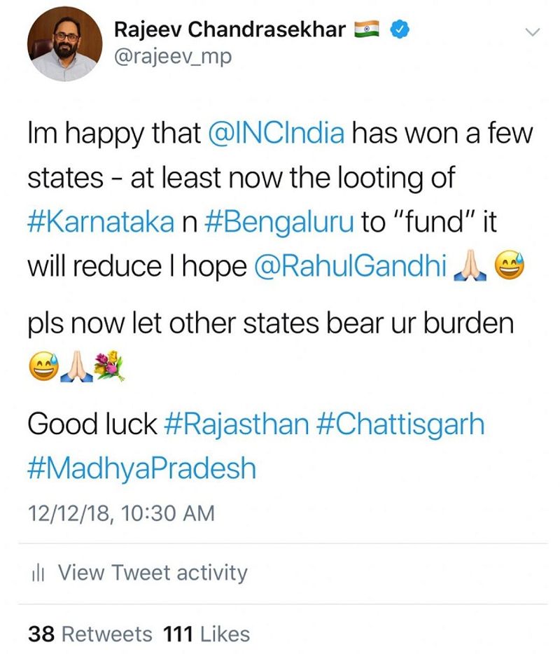 காங்கிரஸ் கட்சி சில மாநிலங்களில் வெற்றி பெற்றுள்ளதற்காக ராகுல் காந்திக்கு வாழ்த்து தெரிவித்துள்ள பாஜக மாநிலங்களவை உறுப்பினர் ராஜீவ் சந்திரசேகர் கர்நாடகாவில் ஆளும் அரசு நிதியை கொள்ளை அடித்துவிடாமல் தடுக்க வேண்டிய பொறுப்பு அவருக்கு உள்ளது என்றும் இதை அவர் தடுக்காவிட்டால் அவருடைய மதிப்பு குறைந்து போகும் என்றும் தெரிவித்துள்ளார்.