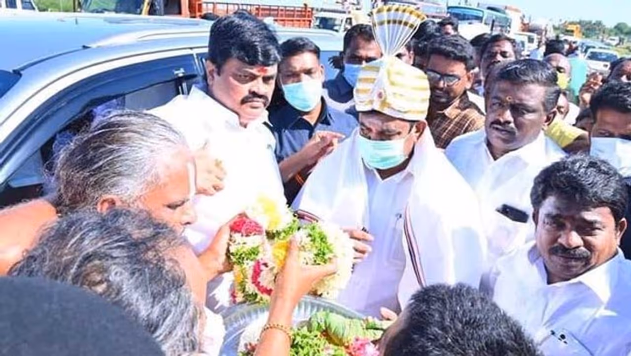 அப்போது, சாத்தூர் அருகே வெங்கடாசலபுரம் சந்திப்பில் எடப்பாடியை பழனிசாமியை விருதுநகர் மேற்கு மாவட்ட செயலாளர் ராஜேந்திர பாலாஜி தலைமையில் மாவட்ட கழக நிர்வாகிகள் உற்சாகமாக வரவேற்பு அளித்தனர். இதனையடுத்து, சால்வை அணிவித்த பின் யாரும் எதிர்பாராத விதமாக ராஜேந்திர பாலாஜி எடப்பாடி பழனிசாமி காலில் விழுந்து ஆசிப்பெற்றார். பின்னர், மேளதாளங்கள் முழங்க விருதுநகர் ராமர் கோவில் சார்பாக பூரண கும்ப மரியாதை கொடுக்கப்பட்டது.