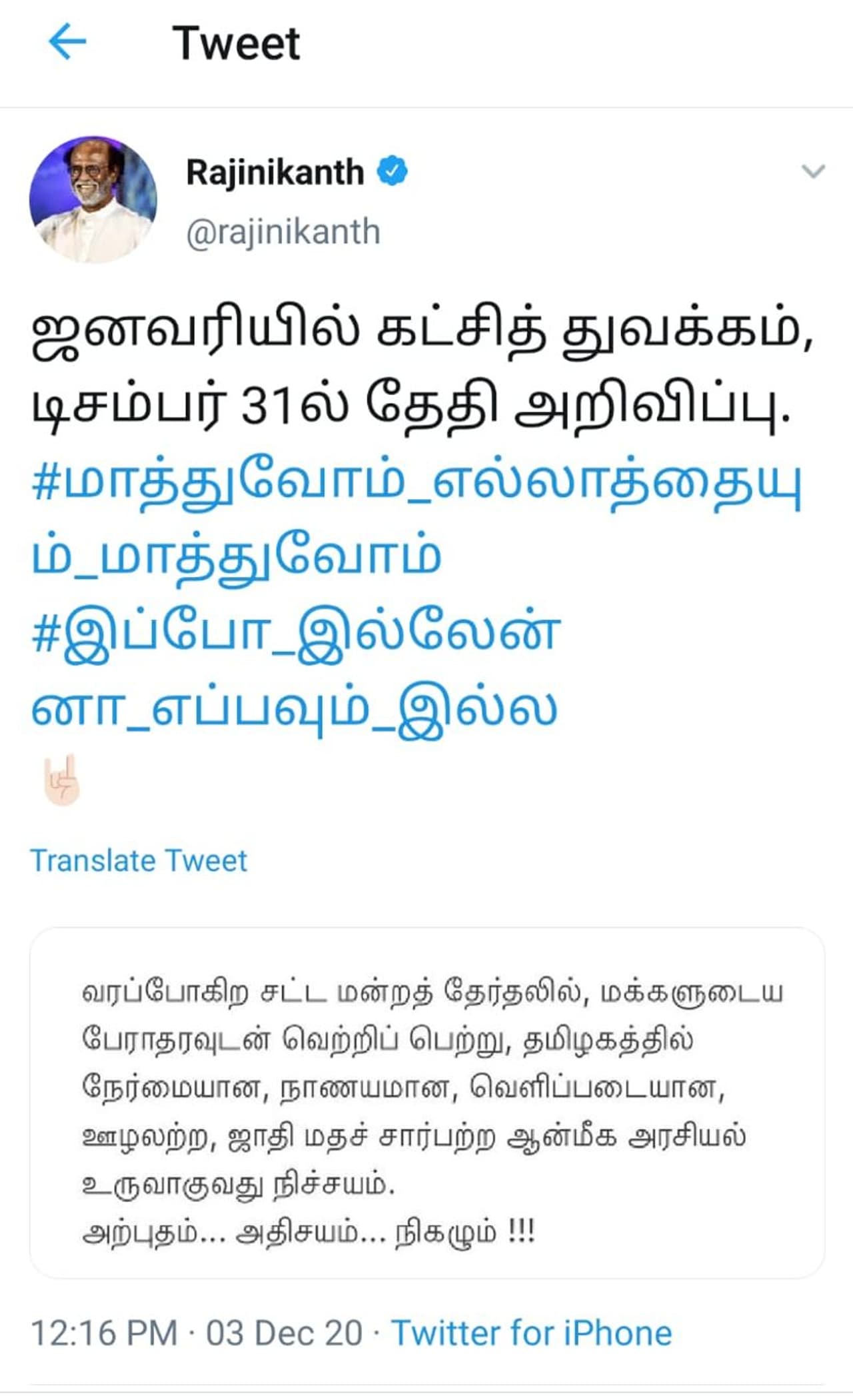 இந்நிலையில் நடிகர் ரஜினிகாந்த் தனது டுவிட்டர் பக்கத்தில் அதிரடியாக, ஜனவரியில் கட்சி துவக்கம், டிசம்பர் 31-ல் தேதி அறிவிப்பு என பதிவிட்டுள்ளார். மேலும், மாற்றுவோம்... எல்லாத்தையும் மாற்றுவோம்... இப்போ இல்லன்னா.. எப்பவும் இல்ல. வரப்போகிற சட்டமன்ற தேர்தலில் மக்களுடைய பேராதரவுடன் வெற்றி பெற்று தமிழகத்தில் நேர்மையான நாணயமான வெளிப்படையான ஊழலற்ற ஜாதி மத சார்பற்ற ஆன்மீக அரசியலை உருவாக்குவது நிச்சயம். அற்புதம்... அதிசயம் நிகழும்..!!! என பதிவிட்டுள்ளார். அவரது இந்த பதிவு ரசிகர்கள் மத்தியில் மிகுந்த மகிழ்ச்சியையும் அளவற்ற உற்சாகத்தையும் ஏற்படுத்தியுள்ளது. ரஜினிகாந்த் அரசியல் வருகை கானல் நீராகி விட்டது என கூறி வந்தவர்களுக்கு அவரின் இந்த முடிவு மிகுந்த அதிர்ச்சியை ஏற்படுத்தியுள்ளது.