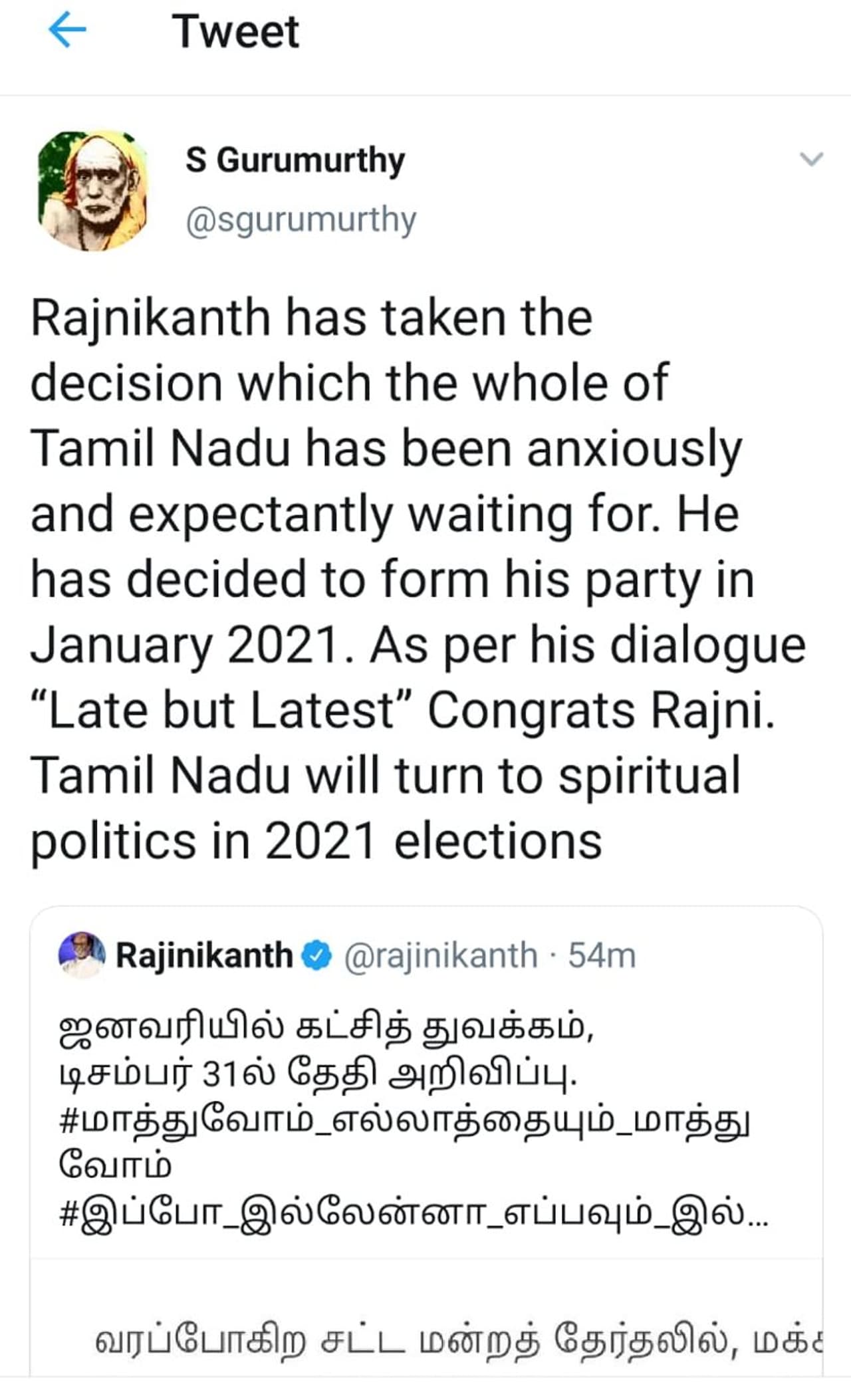 இந்நிலையில் இது குறித்து பல்வேறு அரசியில் கட்சி தலைவர்கள் மற்றும் அரசியல் நோக்ககர்கள் கருத்து கூறி வருகின்றனர். ரஜினி அரசியலுக்கு வர வேண்டும் என பல ஆண்டுகலாக அவரை வலியுறுத்தி வந்தவர்களில் முதலிலும், முன்னணியிலும் இருப்பவர் ஆடிட்டர் குருமூர்த்தி ஆவார். அவர் ரஜினியின் அரசியல் வருகை குறித்து தனது டிவிட்டர் பக்கத்தில் கூறியிருப்பதாவது:- தமிழக மக்கள் நீண்ட காலமாக ரஜினியின் வருகைக்காக காத்திருக்கின்றனர். ரஜினியில் இந்த அறிவிப்பு சரியான நேரத்தில் எடுக்கப்பட்ட சரியான முடிவு, தலைவர்களுக்கு வெற்றிடம் உள்ள நிலையில் ரஜினி அரசியலுக்கு வர இது சரியான தருணம், இந்த முடிவு தாமதமாக எடுக்கப்பட்ட முடிவு என்றாலும் காலத்திற்கு ஏற்ற முடிவு, Late But Latest எனவும், வரும் 2021 சட்டமன்ற தேர்தல் தமிழகத்தை ஆன்மீகத்தை நோக்கி பயணிக்க வைக்கும் எனவும், ரஜனியின் அரசியல் முடிவுக்கு எனது வாழ்த்துக்கள் எனவும் பதிவிட்டுள்ளார்.
