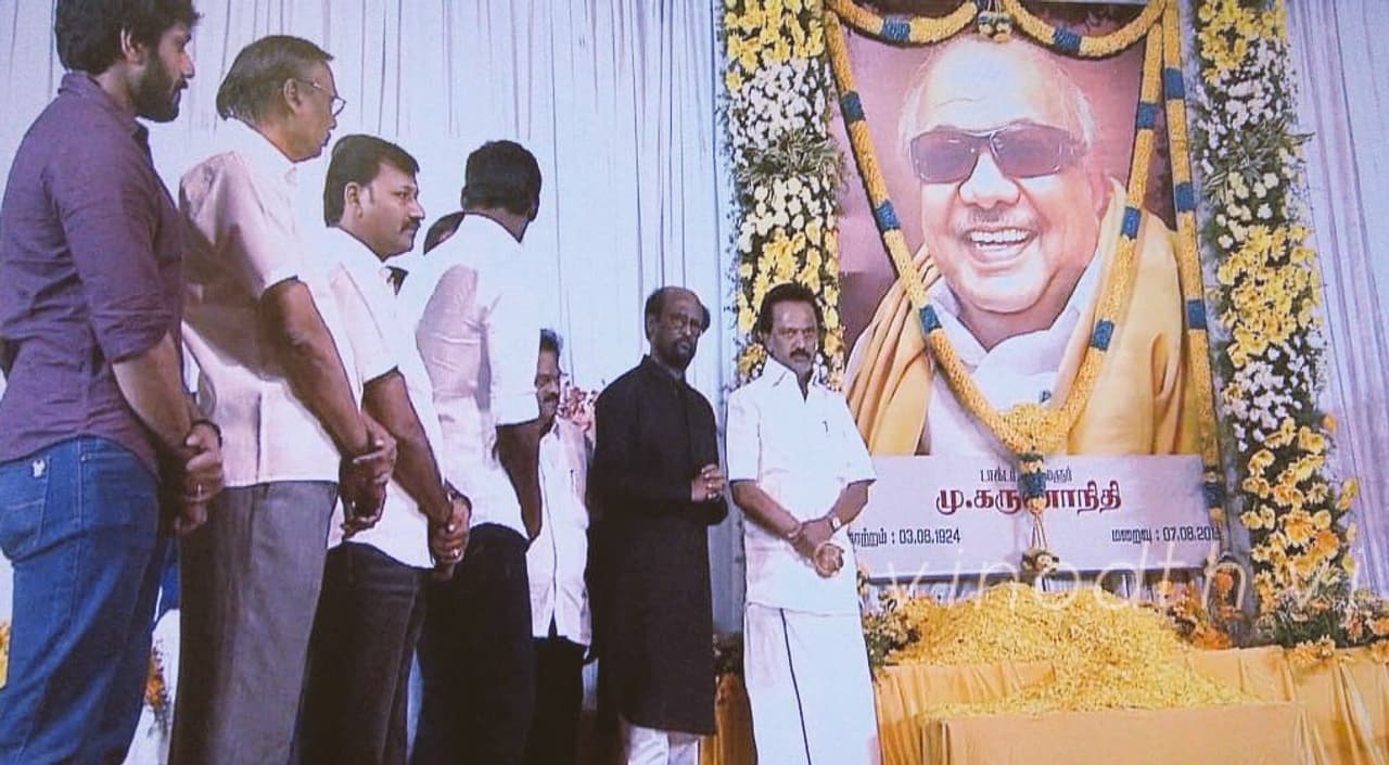 சென்னையில் நடிகர் சங்கம் மற்றும் தயாரிப்பாளர் சங்கம் சார்பில் நடைபெற்ற கலைஞர் நினைவேந்தல் கூட்டத்தில் முதலமைச்சர் எடப்பாடி பழனிசாமிக்கு எதிராக ரஜினி பேசிய பேச்சு அவரது அரசியல் ஆட்டத்திற்கான அச்சாணியாக பார்க்கப்படுகிறது. மாலை 6 மணிக்கு நினைவேந்தல் கூட்டம் துவங்கினால் ரஜினி எட்டு மணிக்கு பிறகே காமராஜர் அரங்கிற்கு வருகை தந்தார். நிகழ்ச்சி நடைபெற்ற அரங்கிற்கு வந்த ரஜினியை நாசர், விஷால் உள்ளிட்டோர் வரவேற்று மேடைக்கு அழைத்துச் சென்றனர். அப்போது மு.க.ஸ்டாலினும் அவர்களுடன் சேர்ந்து கொண்டார். மேடையில் கலைஞர் புகைப்படத்திற்கு மலர் தூவி அஞ்சலி செலுத்திய ரஜினி பின்னர் மெழுகுவர்த்தியும் ஏற்றினார்.