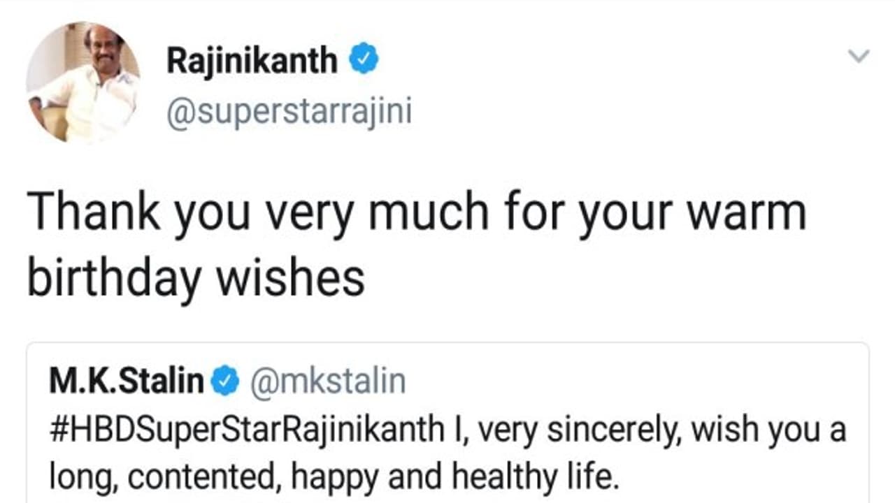 தனது பிறந்த நாளுக்கு வாழ்த்து சொன்ன திமுக செயல்தலைவர் ஸ்டாலின் மற்றும் துணை முதலமைச்சர் பன்னீர்செல்வத்திற்கும் நடிகர் ரஜினிகாந்த் நன்றி தெரிவித்துள்ளார்.