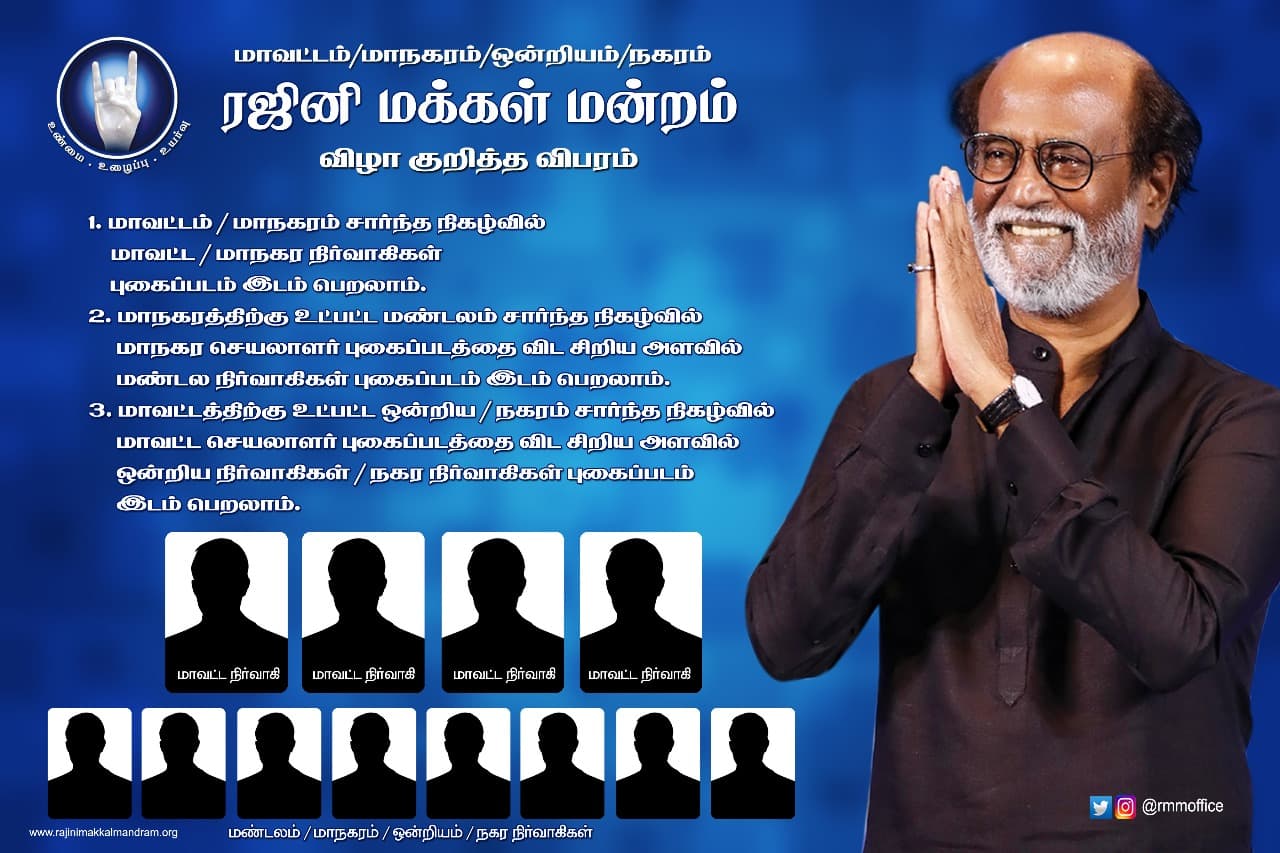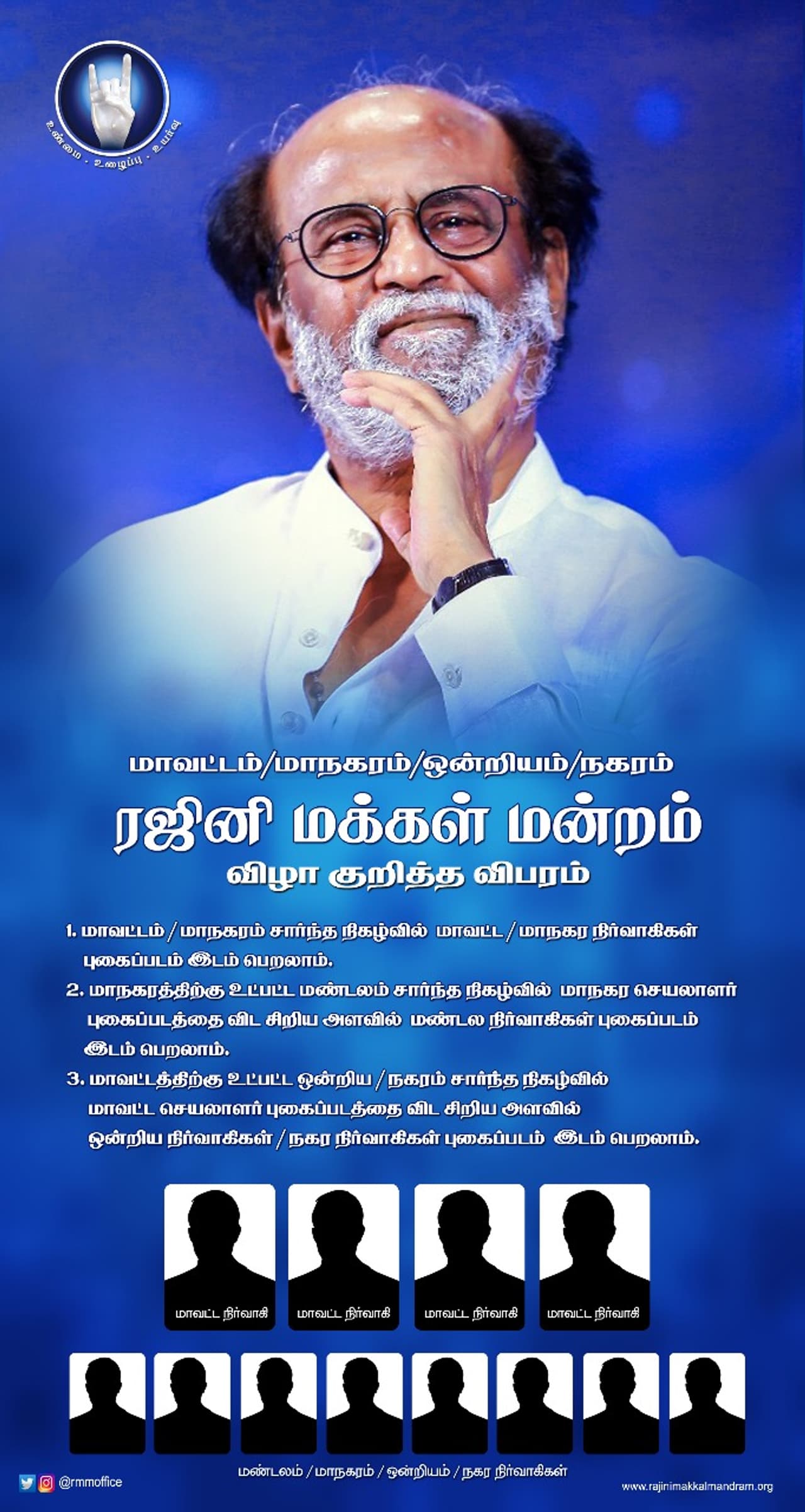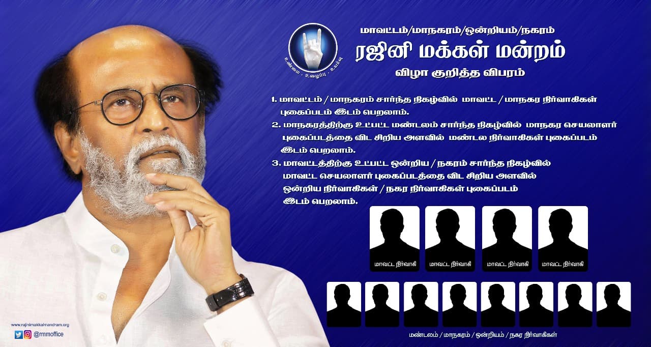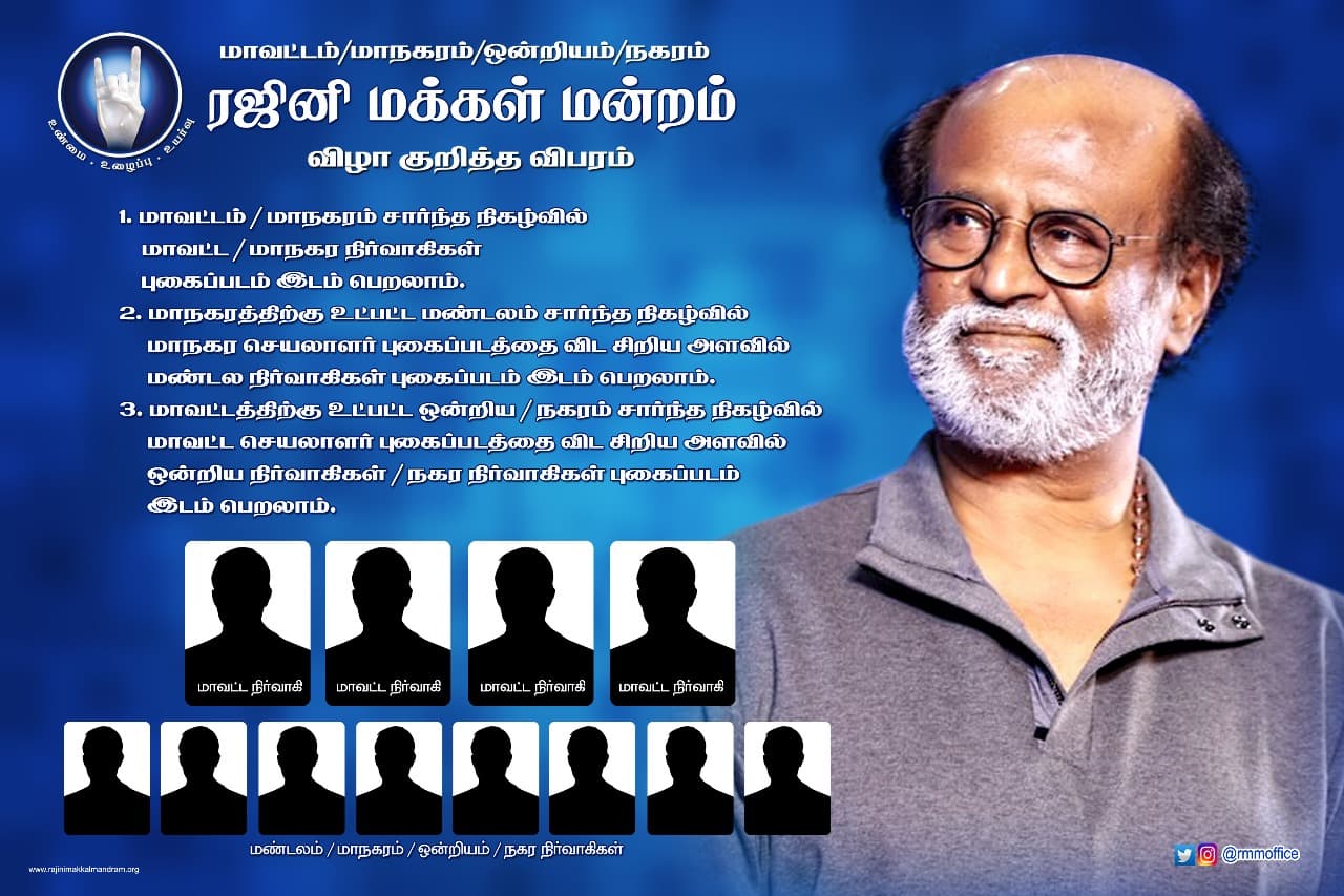 மேலும் போஸ்டர்கள் எந்த அளவில் இருக்க வேண்டும், யார் யார் புகைப்படம் பெரிதாக இருக்க வேண்டும், சிறியதாக இருக்க வேண்டும் என்பது குறித்தும் ரஜினி அறிவித்துள்ளது. அரசியலில் புதிய அத்தியாயமாக கருதப்படுகிறது.