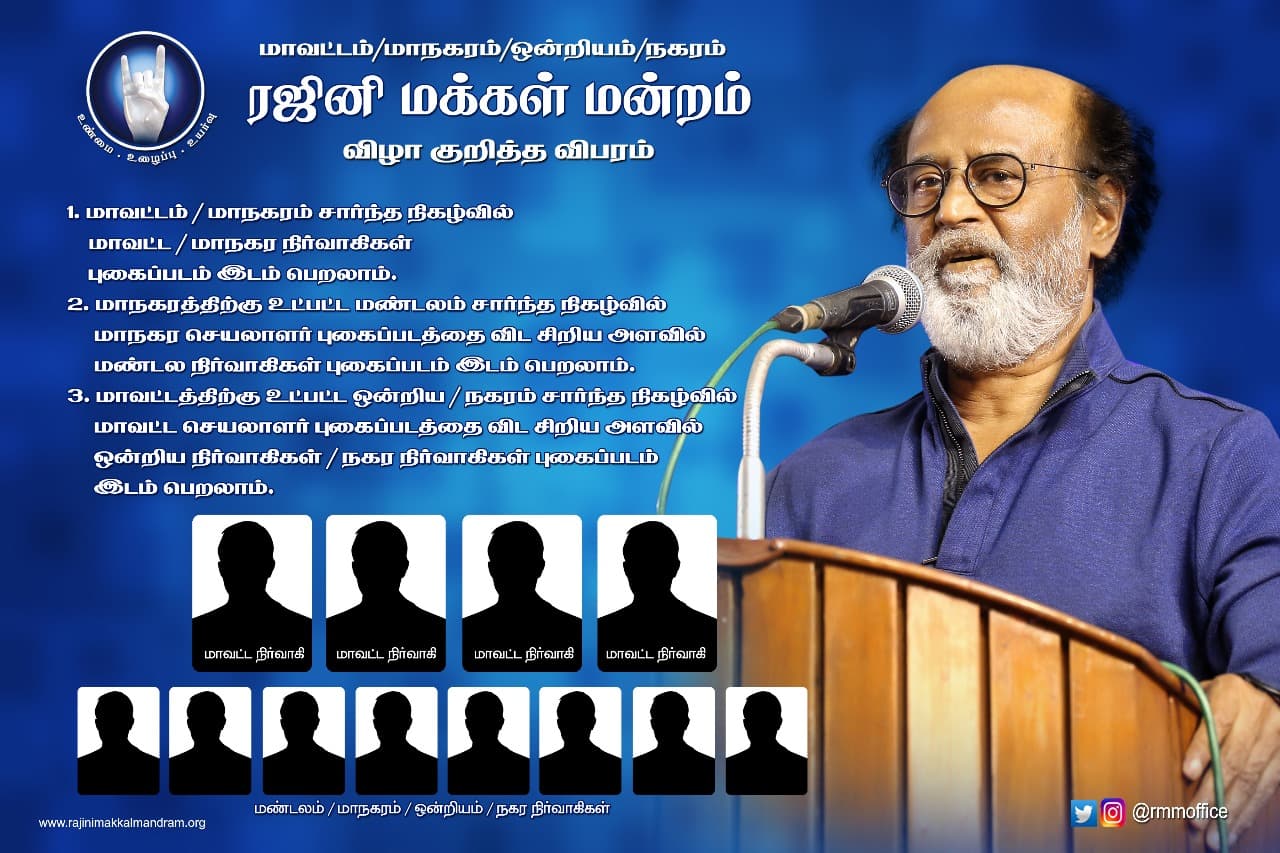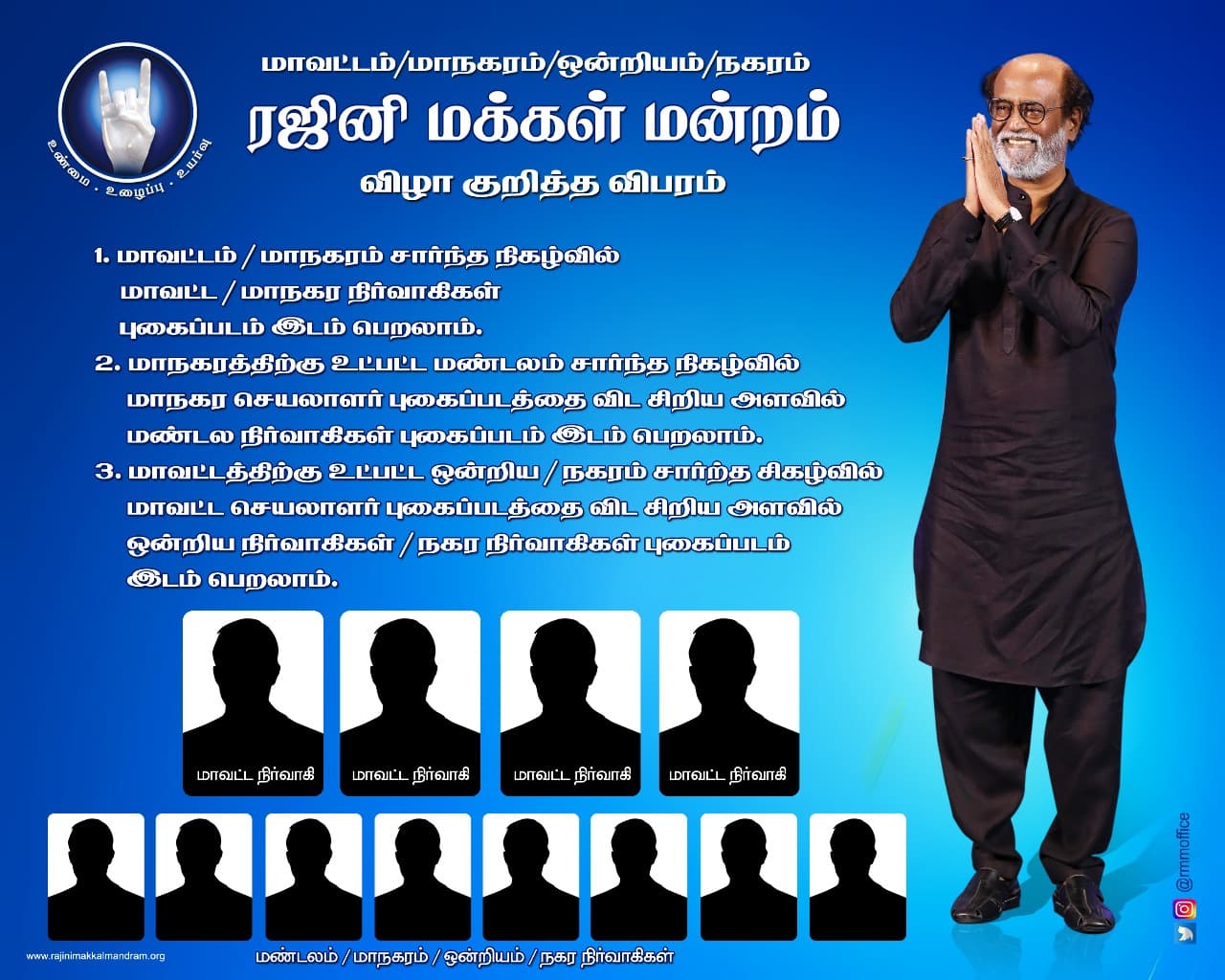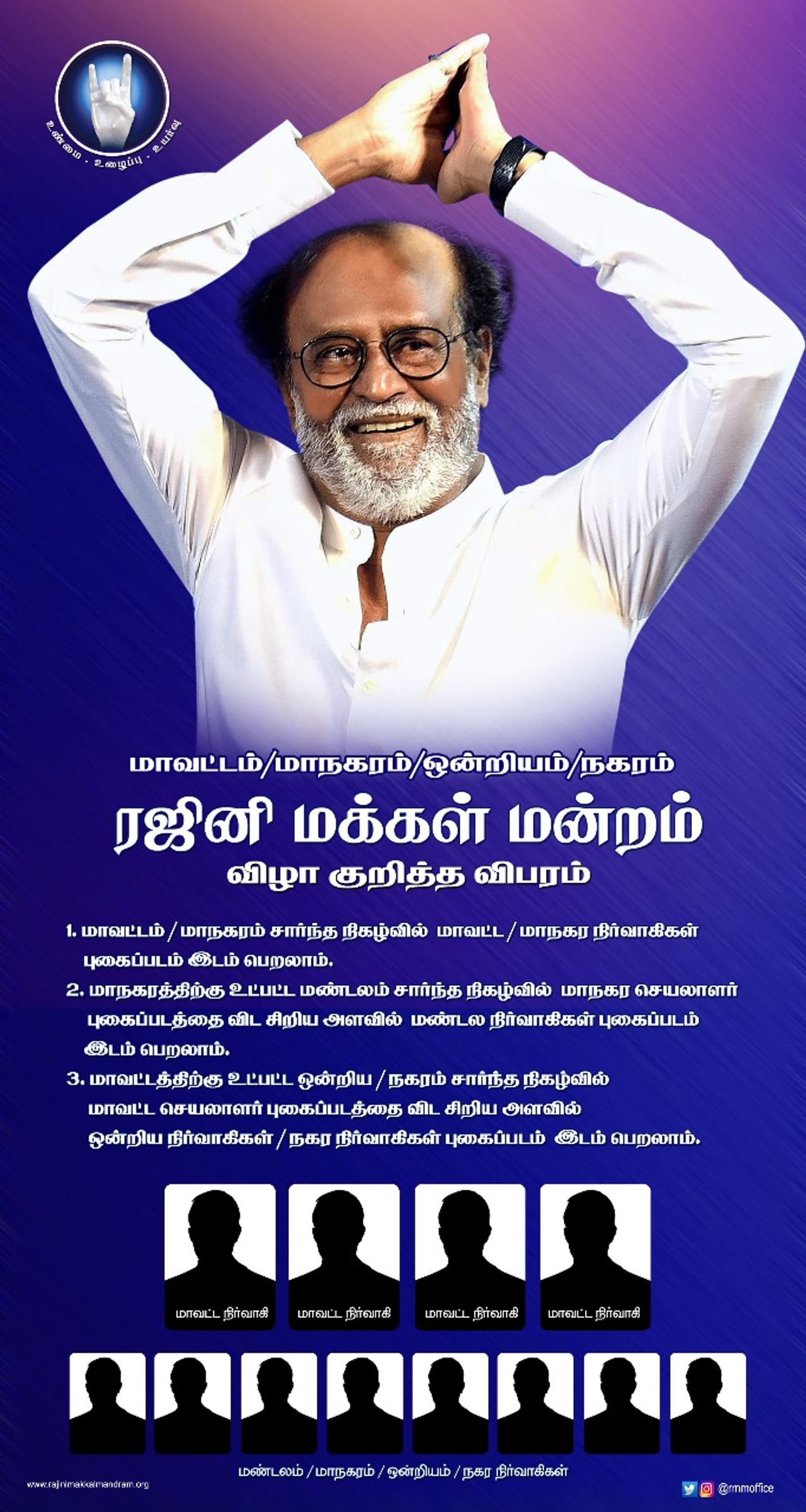 மேலும் போஸ்டர்கள் எந்த அளவில் இருக்க வேண்டும், யார் யார் புகைப்படம் பெரிதாக இருக்க வேண்டும், சிறியதாக இருக்க வேண்டும் என்பது குறித்தும் ரஜினி அறிவித்துள்ளது. அரசியலில் புதிய அத்தியாயமாக கருதப்படுகிறது.