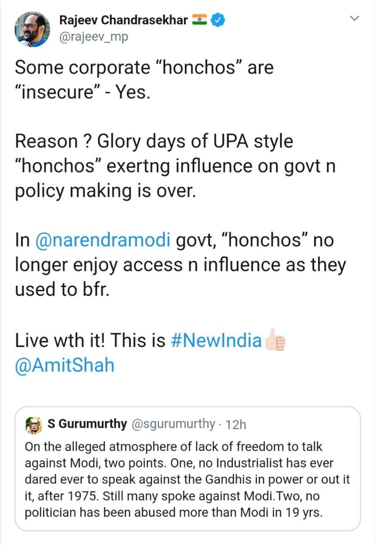 இது குறித்து கருத்து தெரிவித்துள்ள பாஜக மாநிலங்களவை உறுப்பினர் ராஜீவ் சந்திரசேகர், சில கார்ப்பரேட் நிறுவனங்கள் பாதுகாப்பின்மையை உணர்வதாக தெரிவித்துள்ளன. அதற்கு காரணம் என்ன தெரியுமா ?