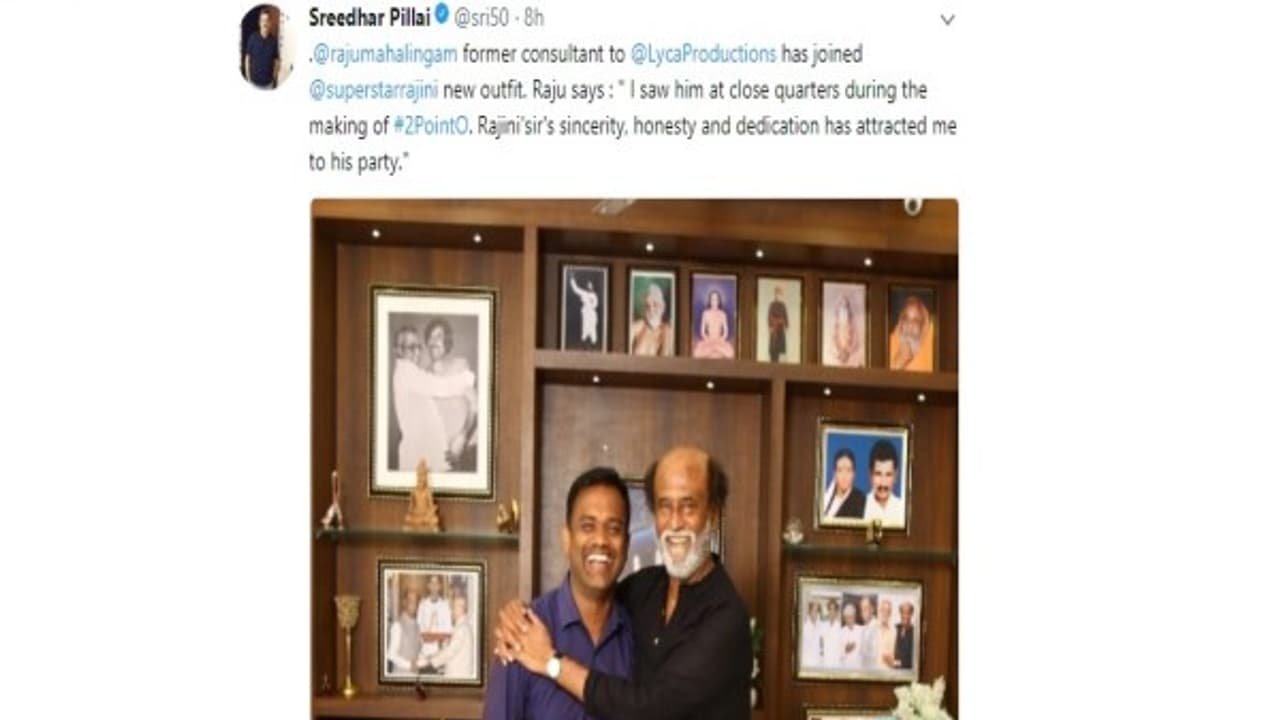கடந்த 31ஆம் தேதி ரஜினி தனிக் கட்சி ஆரம்பிக்கப்போவதாக அதிகாரபூர்வமாக அறிவித்த நிலையில் ரஜினி ஆரம்பிக்கும் கட்சியில் சேரப்போவதாக ராஜு மகாலிங்கத்தின் ட்விட்டர் பக்கத்தில் உறுதியான தகவல் வெளியிட்டுள்ளார்.. இதற்காக லைகா நிறுவன இந்தியக் கிளையின் தலைவர் பதவியை ராஜினாமா செய்துள்ள நிலையில், ராஜூ மகாலிங்கத்திற்கு ரஜினிகாந்த் தொடங்கும் கட்சியில் முக்கிய பதவி வழங்கப்படும் என தகவல்கள் தெரிவிக்கின்றன.