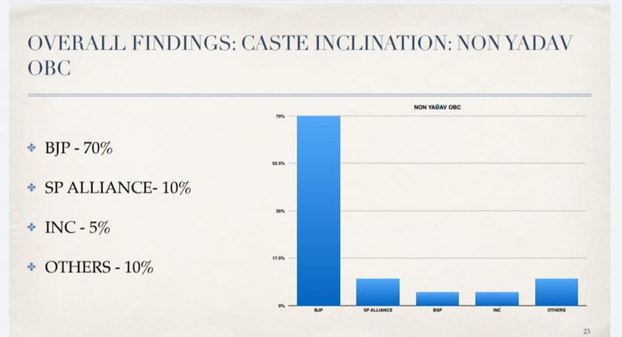 ஜாட் அல்லாத பட்டியலின மக்களின் மத்தியில் நடத்தப்பட்ட கருத்துக்கணிப்பில், பாஜகவுக்கே ஆதரவு என 40 சதவீதம் பேரும், சமாஜ்வாடி கட்சிக்கு 35% பேரும், பகுஜன்சமாஜ் 20% பேரும், மற்றவைக்கு என 10 சதவீதம் பேரும் கருத்து தெரிவித்துள்ளனர். இவற்றை வைத்துப் பார்க்கும் போது, பிராமண சமூகமாக இருந்தாலும் சரி, யாதவர்கள் அல்லாத ஓபிசி பிரிவினராக இருந்தாலும் சரி, ஜாட் மற்றும் பட்டியலின சமூகத்தினர் மத்தியிலும் பாஜகவுக்கு ஆதரவு இருப்பது தெரியவந்துள்ளது.