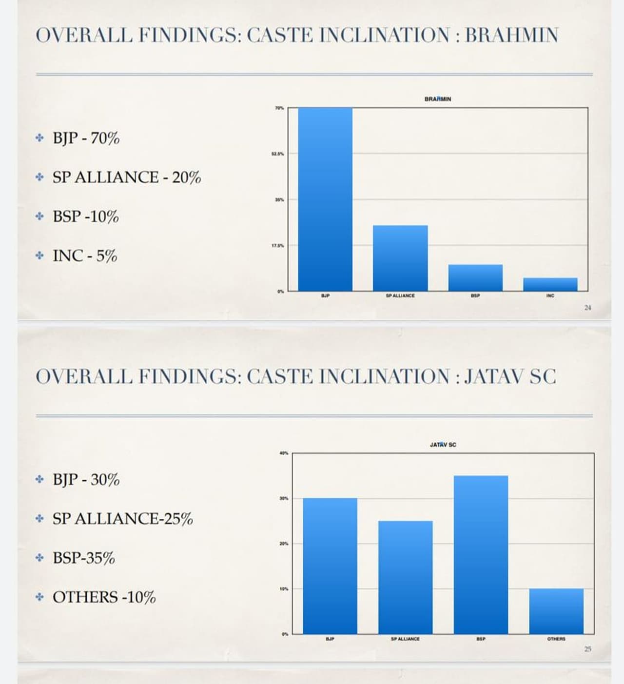 உத்திரபிரதேசம் மாநிலம் 20% பிராமண சமுதாயத்தினர் நிறைந்த மாநிலமாக உள்ளது. அங்குள்ள பிராமண சமுதாய மக்களின் ஆதரவு யாருக்கு இருக்கக் கூடும் என நடத்தப்பட்ட கருத்துக் கணிப்பில், பாஜகவுக்கு 70 சதவீதம் ஆதரவு உள்ளது என்றும், சமாஜ்வாடி கட்சிக்கு 20% பேரும், பகுஜன்சமாஜ் 10% பெரும், இந்திய தேசிய காங்கிரஸ் 5 சதவீதம் பேரும் ஆதரவு தெரிவித்துள்ளனர். அதேபல் அங்கு பிரதான சமூகங்களாக உள்ள ஜாட் பட்டியலின மக்கள் மத்தியில் நடத்தப்பட்ட கருத்துக்கணிப்பில், 30 சதவீதம் பேர் பாஜகவுக்கும், சமாஜ்வாடிக்கு 25 சதவீதப் பேரும், பகுஜன் சமாஜ் கட்சிக்கு 35 சதவீதம் பேரும், பிறகு கட்சிக்கு 10 சதவீதம் பேரும் ஆதரவு தெரிவித்துள்ளனர்.