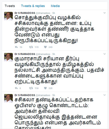2011 - 2016 காலத்தில் அமைச்சர்களாக இருந்த அனைவர் மீதும் சொத்துகுவிப்பு வழக்கு பதிவு செய்யப்பட வேண்டும் எனவும், ஜெ. இன்று உயிருடன் இருந்திருந்தால் பரப்பன அக்ரஹார சிறைக்கு சென்றிருக்க வேண்டும் எனவும், சசிகலாவுக்கு வழங்கப்பட்ட தண்டனை ஜெயலலிதாவுக்கும் பொருந்தும் என ஒ.பி.எஸ் அணிக்கு சொல்லுங்கள் என ராமதாஸ் தெரிவித்துள்ளார்.