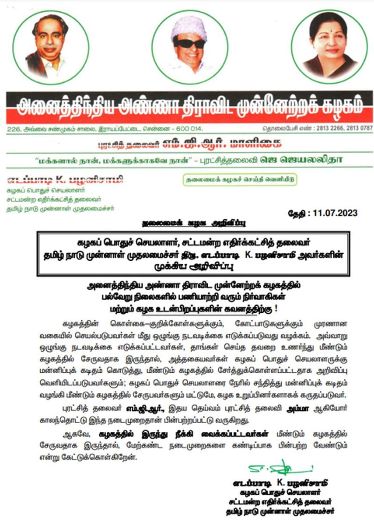 ஒழுங்கு நடவடிக்கை எடுக்கப்பட்டவர்கள் பொதுச்செயலாளரிடம் மன்னிப்புக் கடிதம் கொடுத்து மீண்டும் கட்சியில் சேருபவர்கள் மட்டுமே கட்சி உறுப்பினர்களாக கருதப்படுவர் என எடப்பாடி பழனிசாமி தெரிவித்துள்ளார்.