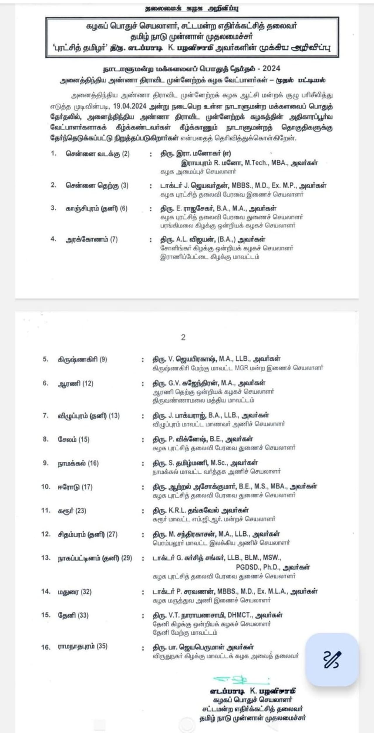 நாடாளுமன்ற தேர்தலில் அதிமுக சார்பாக போட்டியிடவுள்ள முதல் கட்ட வேட்பாளர் பட்டியலை அதிமுக பொதுச்செயலாளர் எடப்பாடி பழனிசாமி வெளியிட்டுள்ளார்.