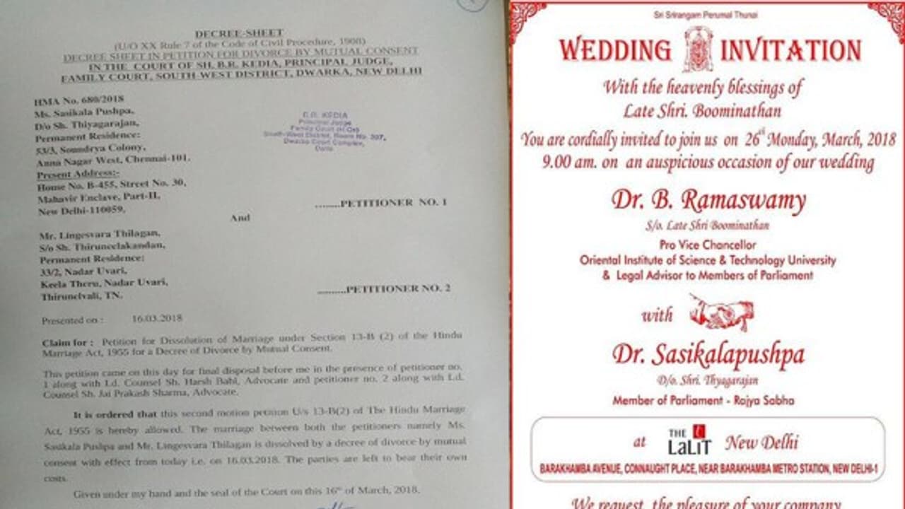 அதிமுகவில் இருந்து ஜெயலலிதா இருக்கும்போதே நீக்கப்பட்ட மாநிலங்களவை உறுப்பினர் சசிகலா புஷ்பாவுக்கு வரும் மார்ச் 26ஆம் தேதி திருமணம் நடைபெற இருப்பதாக தகவல் தாங்கி, வாட்ஸ்அப்பில் பரவி வருகிறது ஓர் அழைப்பிதழை அடுத்து சசிகலா புஷ்பாவிற்கும் அவரது கணவருக்கும் விவாகரத்து ஆன சான்றிதழ் வெளியாகியிருக்கிறது.