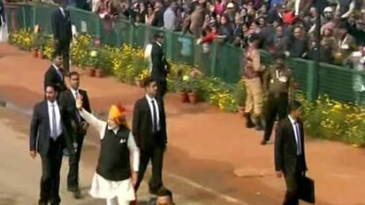 விழாவில் காவி, சிவப்பு மற்றும் பச்சை நிறம் கொண்ட தலைப்பாகை அணிந்திருந்த பிரதமர் மோடி, அணிவகுப்பு முடிந்த பின்னர் மரபுகளை மீறி, விழா மேடையிலிருந்து கீழே இறங்கி ராஜ்பாத்திற்கு தனது பாதுகாவலர்களுடன் வந்தார். தொடர்ந்து விழாவிற்கு வந்திருந்த மக்கள் அருகில் சென்று, அவர்களை நோக்கி உற்சாகமாக கையசைத்தார்.