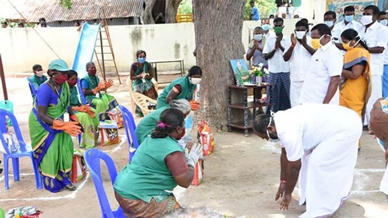 திருமங்கலம் சட்டமன்றத் தொகுதியில் துப்புரவு பணியாளர்களுக்கு நலத்திட்ட உதவி வழங்கிய வருவாய்துறை அமைச்சர் உதயக்குமார், அவர்களது காலில் விழுந்து வணங்கினார்.இச்சம்பவம் அந்த தொழிலாளர்கள் அனைவரையும் நெகிழச் செய்தது.