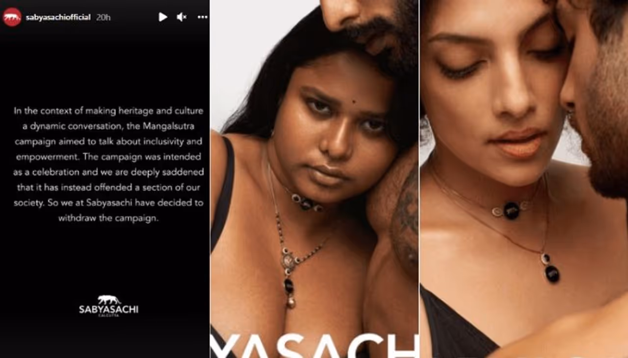 சப்யசாச்சியின் பிராண்டின் மங்களசூத்ரா விளம்பரத்தில் ஒரு பெண் கழுத்து நெக்லைன் ஆடை அணிந்து தனியாகவும், ஆணுடன் நெருக்கமாகவும் போஸ் கொடுப்பதைக் காட்டியது. மங்களசூத்திரம் என்பது திருமணமான இந்துப் பெண்கள் அணியும் நெக்லஸ் ஆகும். கடந்த வாரம், டாபர் இந்தியா பிரைவேட் லிமிடெட் அதன் ஃபெம் கிரீம் ப்ளீச் விளம்பரத்தை திரும்பப் பெற்றது. இது ஒரே பாலின ஜோடி கர்வா சௌத்தை கொண்டாடியது