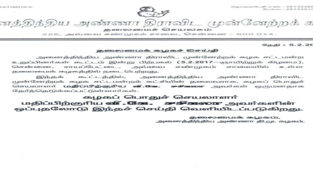 சசிகலாவை நியமிக்க சசிகலா ஒப்புதலோடு கடிதம் ........!!!!!!