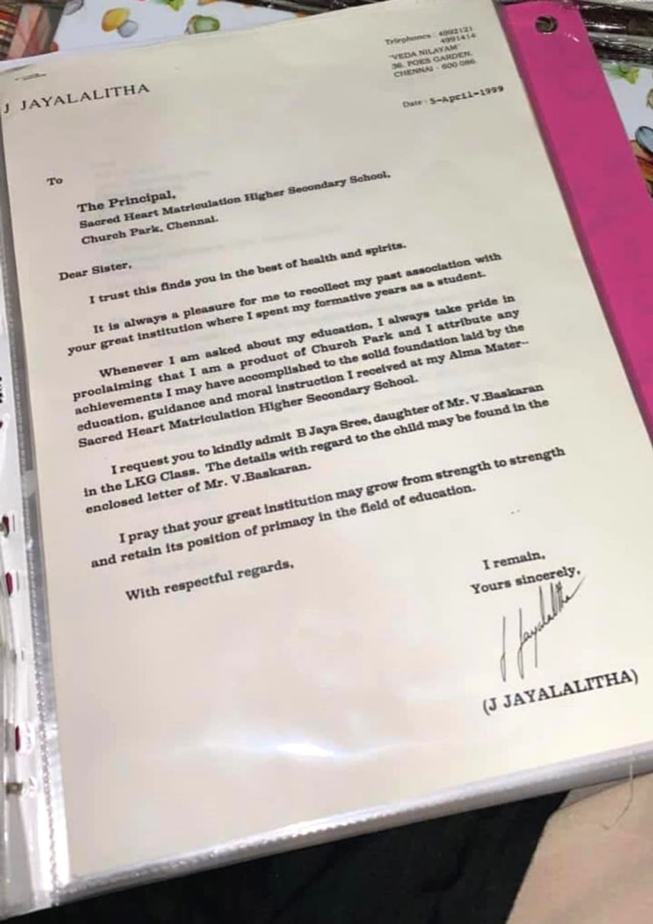 முன்னாள் முதலமைச்சர் ஜெயலலிதாவின் நெருங்கிய வட்டத்திற்குள் சசிகலாவின் உறவினர்கள் பலரும் இருந்தனர்.இது அனைவருக்கும் தெரிந்த விஷயம் ஆகும். இந்நிலையில் இன்று முன்னாள் முதல்வர் ஜெயலலிதாவின் 5 ஆம் ஆண்டு நினைவு நாள்.இதனையொட்டி சசிகலாவின் சகோதரர் ஆன திவாகரன் மகன் ஜெயானந்த், பேஸ்புக்கில் இன்று ஒரு பதிவை வெளியிட்டு இருக்கிறார்.அதில், ‘என் மனைவி ஜெயஶ்ரீயை சர்ச் பார்க் பள்ளியில் சேர்க்க வேண்டும் என ஜெயலலிதா அம்மா எழுதிய கடிதம் இது ஆகும். இதுபோல் பழைய நினைவுகள் சம்பந்தப்பட்ட விஷியங்களை பாதுகாத்து வருகிறார் என் மனைவி ஜெயஶ்ரீ. அதில் ஒருகடிதம் இது’ என்று பதிவிட்டு இருக்கிறார். இந்த பதிவு நெகிழ்ச்சியை ஏற்படுத்தி இருக்கிறது.