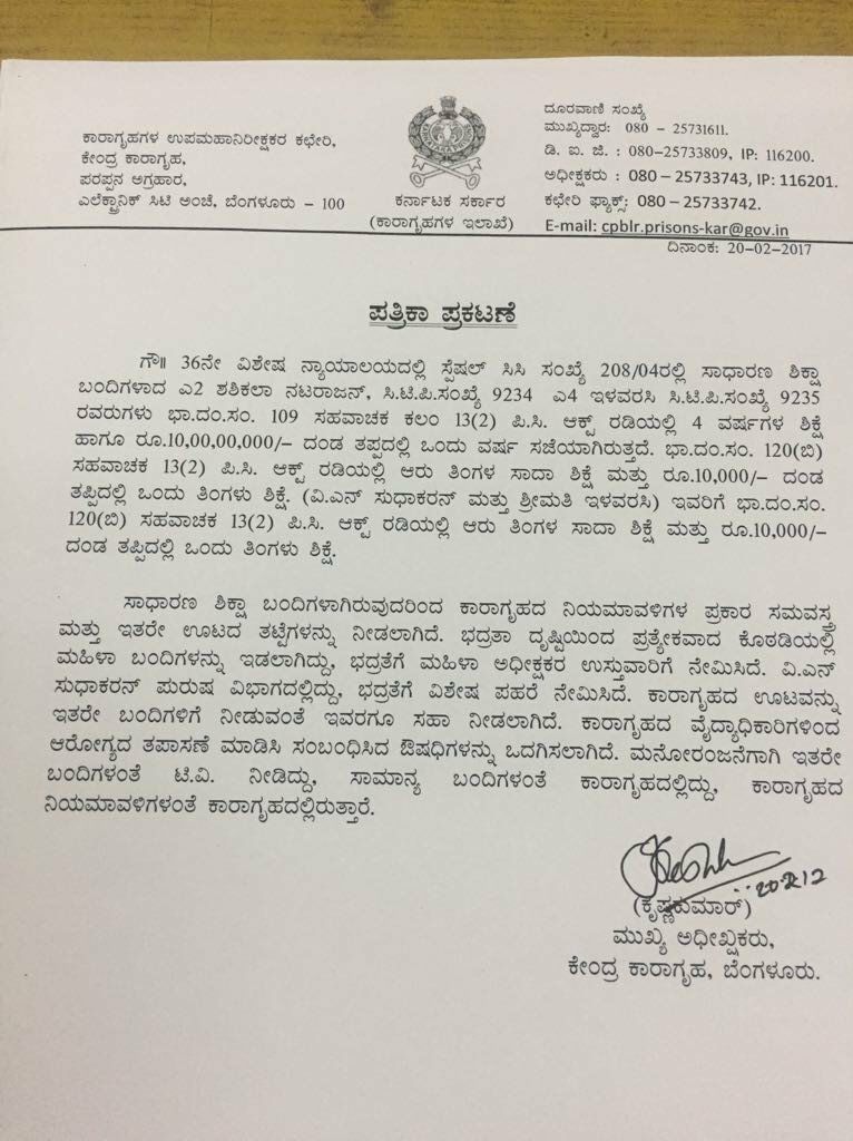 சொத்துக் குவிப்பு வழக்கில் சசிகலா, இளவரசி மற்றும் சுதாகரனுக்கு விதிக்கப்பட்ட 10 கோடி ரூபாய் அபராதத் தொகையை கட்டாவிட்டால் மேலும் ஓர் ஆண்டு ஜெயிலில் இருக்க வேண்டும் பெங்களூரு சிறை நிர்வாகம் எச்சரித்துள்ளது.