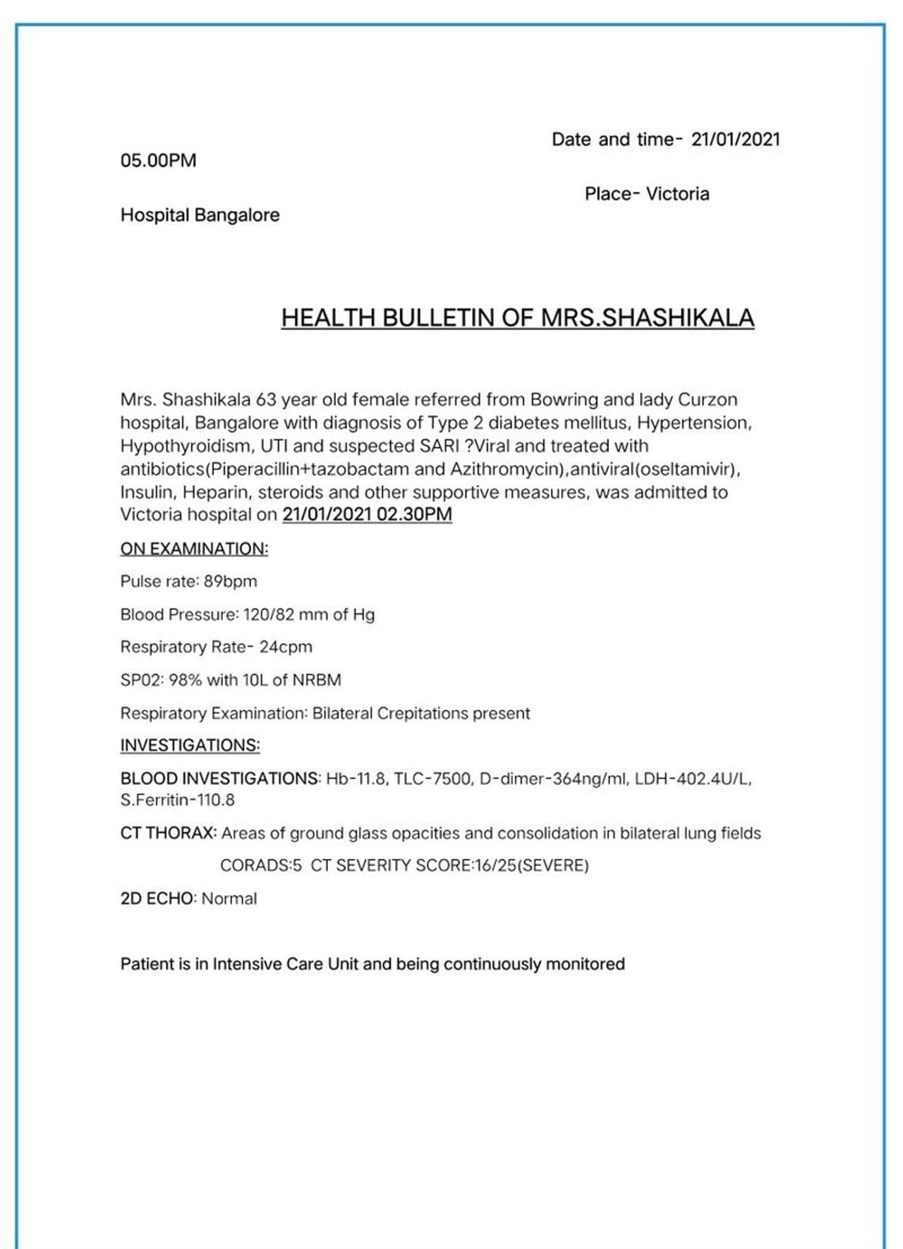 இந்நிலையில், சசிகலா உடல்நிலை குறித்து மருத்துவனை வெளியிட்டுள்ள அறிக்கையில்;- சசிகலா உடல்நிலை சீராக உள்ளது. தீவிர சிகிச்சைப் பிரிவில் சசிகலா தொடர்ந்து மருத்துவர்கள் கண்காணிப்பில் உள்ளார். சர்க்கரையின் அளவு சற்று அதிகமாக உள்ளது. நுரையீரல் தொற்று மேலும் பரவாமல் தடுக்க சசிகலாவிற்கு மருத்துவமனையில் சிகிச்சை அளிக்கப்பட்டு வருகிறது. மேலும், தைராய்டு ஆகிய பிரச்சனைகளுக்கும் சிகிச்சை அளிக்கப்பட்டு வருவதாகவும் கூறப்பட்டுள்ளது.