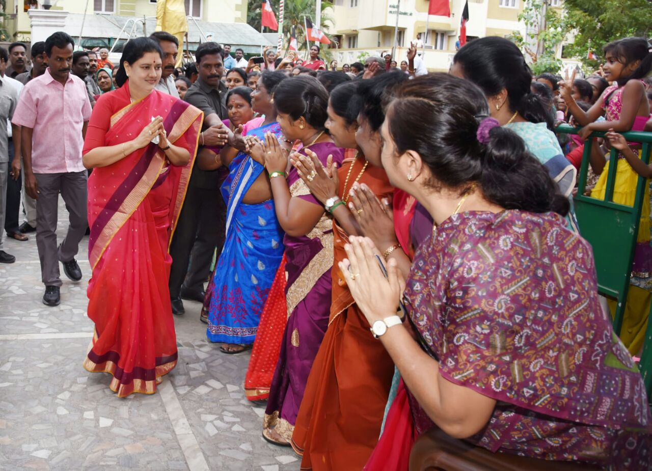 கருப்பு சிவப்பு சேலையில் பளபளவென்று ப்ரெஷ்சாக இருந்த சசிகலா கட்சி அலுவலக பால்கனியில் சென்று தொண்டர்களை பார்த்து உற்சாகமாக கை அசைத்தார்.