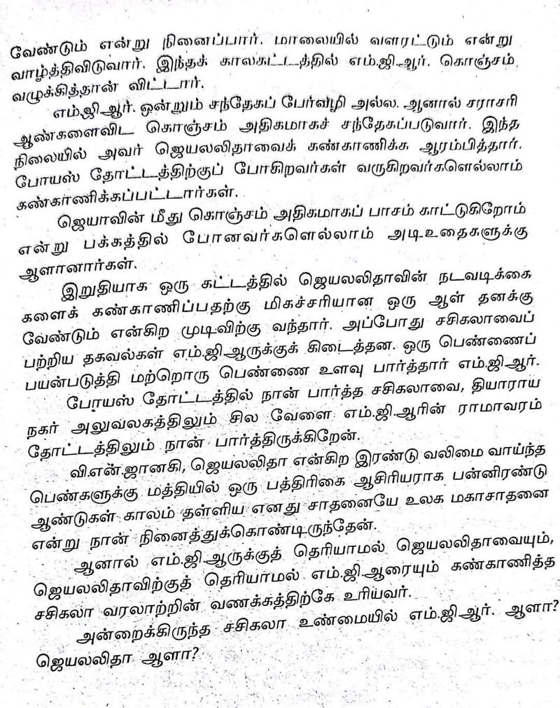 இந்நிலையில் சசிகலா குறித்து எம்ஜிஆரின் தீவிர விசுவாசி வலம்புரி ஜான் எழுதிய "வணக்கம்" புத்தகத்திலிருந்து ஒரு பக்கத்தைக் காட்டி சசிகலாவுக்கும் எம்.ஜி.ஆருக்கும், சசிகலாவுக்கும் இருக்கும் தொடர்பு பற்றி கூறப்பட்டுள்ளது. அந்தப்பக்கம் கீழே...