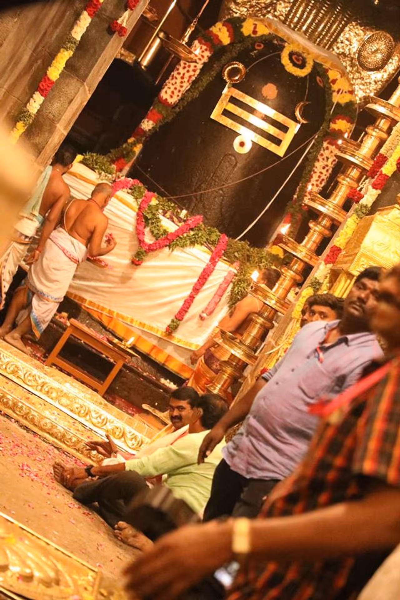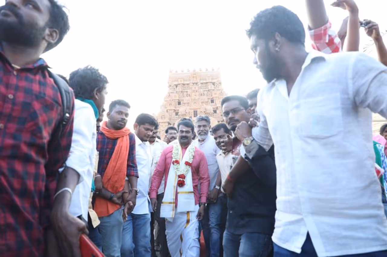 நாம் தமிழர் கட்சியின் தலைமை ஒருங்கிணைப்பாளர் சீமான் தமிழ் குடமுழுக்கை வரவேற்றதோடு மட்டுமில்லாமல் நேற்று மாலை பெரிய கோவிலுக்கு வருகை தந்து பெருவுடையாரை தரிசனம் செய்தார். பெரிய கோவிலின் கேரளாந்தகன் வாயில் வழியாக உள்ளே சென்ற சீமான், பெருவுடையார் சந்நிதியில் பத்து நிமிடங்கள் அமர்ந்து தரிசனத்தில் ஈடுபட்டார். அவருக்கு கோவில் சார்பாக பிரசாதங்கள் வழங்கப்பட்டது. பின் அங்கிருந்து முருகன் சந்நிதிக்கு சென்று தரிசனம் செய்தார். மேலும் அதுதொடர்பான படங்களை தனது ட்விட்டர் மற்றும் முகநூல் பக்கங்களிலும் பதிவிட்டுள்ளார். அதில் 'தமிழ்ப்பேரரசன் அருண்மொழிச்சோழன் கட்டியெழுப்பிய தஞ்சை பெருவுடையார் கோயிலில் ஆதிப்பாட்டன் சிவனைப் போற்றித் தொழுதபோது'..! என குறிப்பிட்டிருக்கிறார்.