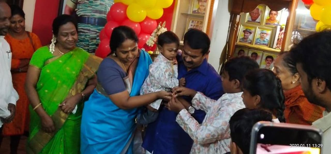 இதனிடையே கடந்த ஆண்டு ஜனவரி 11 அன்று சீமான்-கயல்விழி தம்பதியினருக்கு மகன் பிறந்தான். மகனுக்கு 'மாவீரன் பிரபாகரன்' என மேடைக்கு மேடை முழங்கும் தனது தலைவரின் பெயரை சீமான் சூட்டியுள்ளார். மகன் பிறந்து ஓராண்டு நிறைவடைந்து விட்ட நிலையில் நேற்று மாவீரன் பிரபாகரனுக்கு முதலாவது பிறந்த நாள் விழா கொண்டாடப்பட்டது. இதற்காக சென்னையில் இருக்கும் சீமான் வீட்டில் உறவினர்கள், கட்சியின் முக்கிய நிர்வாகிகள் ஆகியோர் அழைக்கப்பட்டு பிறந்த நாள் விழா நடைபெற்றது. மகனுக்கு கேக் வெட்டி சீமானும் கயல்விழியும் பிறந்தநாளை உற்சாகமாக கொண்டாடினர். தொடர்ந்து வந்திருந்தவர்களுக்கு மதிய விருந்து நடைபெற்றது.