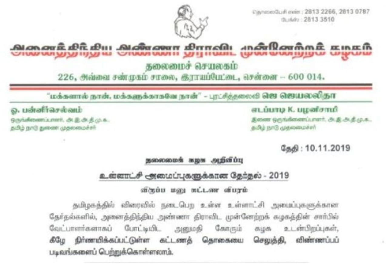 அதிமுக சார்பாக உள்ளாட்சி தேர்தலில் போட்டியிட விரும்புபவர்கள் விருப்பமனுக்களை 15,16 ஆகிய தேதிகளில் பெற்றுக்கொள்ளலாம் என்று அறிவிக்கப்பட்டிருந்தது. அதன்படி இன்று விருப்பமனுக்கள் வழங்கும் நிகழ்வு தொடங்கியது. அந்தந்த மாவட்ட தலைமையகத்தில் காலை 10 மணி முதல் மாலை 5 வரை விருப்பு மனுக்களை விநோயோகிக்கப்படுகின்றன.