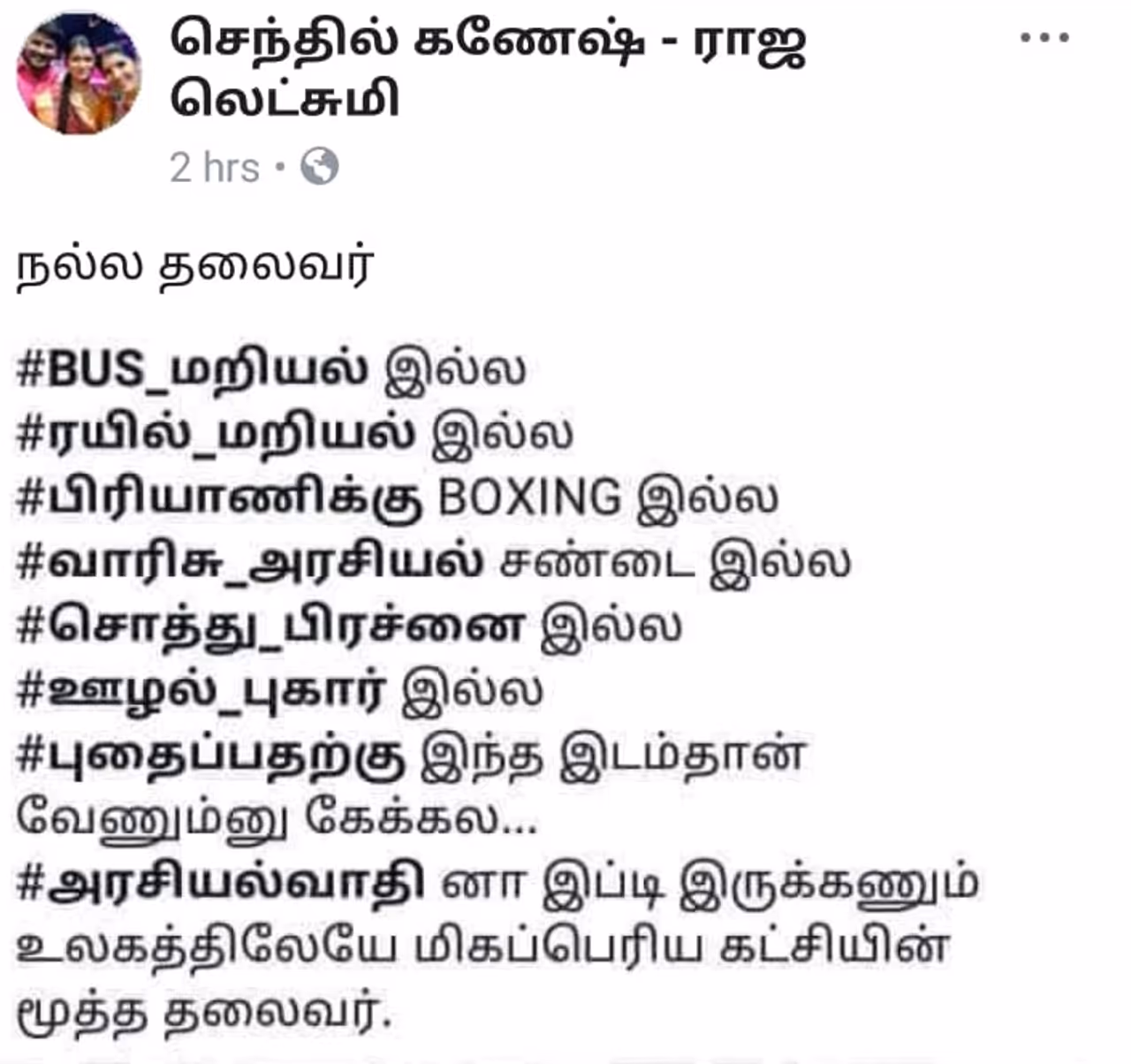 பஸ் மறியல் இல்லை! ரயில் மறியல் இல்லை! பிரியாணிக்கு பாக்ஸிங் இல்லை! வாரிசு அரசியல் சண்டை இல்லை! சொத்து பிரச்சனை இல்லை! ஊழல் புகார் இல்லை! புதைக்க இந்த இடம் தான் வேண்டும் என கேட்கவில்லை! அரசியல்வாதினா இப்படி தான் இருக்கனும். உலகத்திலேயே மிகப்பெரிய கட்சியின் மூத்த தலைவர் வாஜ்பாய் என கூறி அவருக்கு இரங்கல் செலுத்தி இருக்கின்றனர் செந்தில் ராஜலக்ஷ்மி.