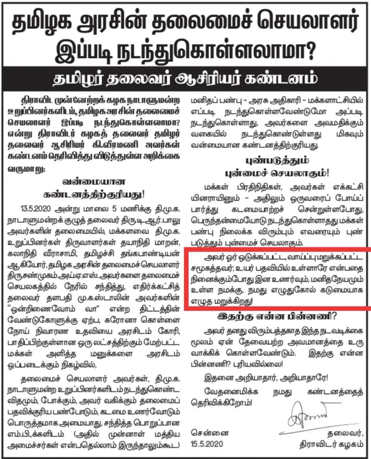சிறுபான்மை மக்களின் காவலன், ஒடுக்கப்பட்ட மக்களின் ஓங்குகுரல் என எப்போதும் முழக்கமிட்டு வரும் திமுகவின் தாய்க்கழகத்தை சேர்ந்த திக தலைவர் கி.வீரமணி அவ்வப்போது சிறுபான்மையினர், ஒடுக்கப்பட்டவர்களை பற்றி கவலை கொள்ளாமல் திமுகவுக்கு துதி பாடுவதை வழக்கமாகக் கொண்டு வருகிறார். அதற்கு மிகச்சிறந்த உதாரணம் அவர் சண்முகத்திற்கெதிராக அறிக்கை விட்டு, தாழ்த்தப்பட்டவர்களை இழிவுபடுத்தியுள்ளது இந்த அறிக்கை.