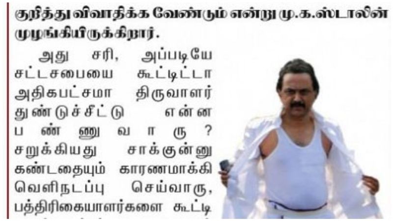 அதில், சட்டசபையை கூட்டி தண்ணீர் பிரச்னை குறித்து விவாதிக்க வேண்டும் என்று மு.க.ஸ்டாலின் முழங்கி இருக்கிறார். அது சரி, அப்படியே சட்டசபையை கூட்டிட்டா அதிகபட்சமா திருவாளர் துண்டுச்சீட்டு என்ன பண்ணுவாரு? சறுக்கியது சாக்குன்னு கண்டதையும் காரணமாக்கி வெளிநடப்பு செய்வாரு, பத்திரிக்கையாளர்களை கூட்டி வைச்சு ஒப்புக்கு ஒரு காரணம் சொல்லிபுட்டு உல்லாச காரில் ஓய்வெடுக்க போயிடுவாரு. அதுக்கு மேலயும் உச்சகட்டமாக நாட்டுக்கு ஏதாவது செய்யனும்னா தன் சட்டையை தானே கிழிச்சிக்கிட்டு தமிழகமே பார் என்று கட்டுக்கதை கட்டி கழக அரசை பழிக்க திட்டங்கள் தீட்டுவாரு.