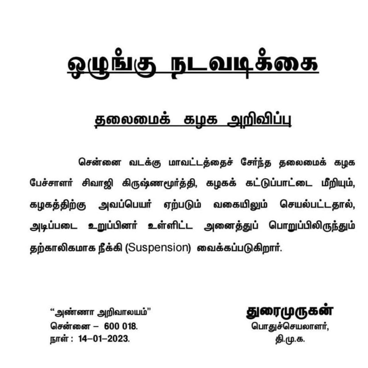 இந்த நிலையில் திமுக பொது செயலாளர் துரைமுருகன் வெளியிட்டுள்ள அறிக்கையில், “சென்னை வடக்கு மாவட்டத்தைச் சேர்ந்த திமுக பேச்சாளர் சிவாஜி கிருஷ்ணமூர்த்தி, கட்சி கட்டுப்பாட்டை மீறியும், கட்சிக்கு அவப்பெயர் ஏற்படும் வகையிலும் செயல்பட்டதால் அடிப்படை உறுப்பினர் உள்ளிட்ட அனைத்துப் பொறுப்பிலிருந்தும் தற்காலிகமாக நீக்கி வைக்கப்படுகிறார் என்று அறிவிப்பு வெளியிட்டுள்ளார்.