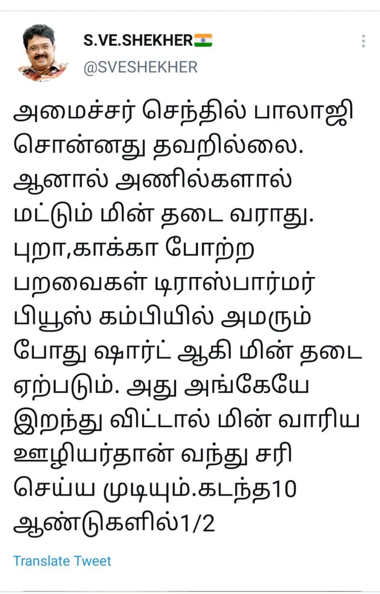 அணில்கலாளும் மின் தடை ஏற்படுகின்றது என்பது உலகில் மின் வாரியங்கள் சந்திக்கும் பெரும் சவால்.. என புகைப்படம் ஒன்றை வெளியிட்டிருந்தார். பறவைகள் அணில்கள் கிளைகளுக்கு இடையே தாவும்போது மின்தடை ஏற்படுகிறது, களப்பணியாளர்கள் உயிரை பணயம் வைத்து சரி செய்வதற்கான பணிகளை முன்னெடுக்கிறார்கள், சவால் தமிழ்நாடு மின்சார வாரியத்திற்கு பெரியதன்று, திட்டமிடல், களப்பணி மூலம் உண்மையான மின்மிகை மாநிலமாக தமிழகத்தை உருவாக்குவோம் என பதிவிட்டுள்ளார் இதற்கு பல தரப்பிலிருந்து ஆதரவும் விமர்சனமும் எழுந்து வருகிறது. இந்நிலையில் எப்போதும் திமுகவை மிக மோசமாக விமர்சிக்க கூடிய பாஜக ஆதரவாளர், நகைச்சுவை நடிகர் எஸ்.வி சேகர், அமைச்சர் செந்தில்பாலாஜியின் கருத்துக்கு ஆதரவு தெரிவித்து தனது ட்விட்டர் பக்கத்தில் கருத்து பதிவிட்டுள்ளார். அமைச்சர் செந்தில்பாலாஜி கூறியதில் தவறு ஒன்றும் இல்லை எனவும் கடந்த 10 ஆண்டுகளாக எங்கள் மயிலாப்பூர் ஏரியாவில் பல தடவை மின்தடை ஏற்பட்டுள்ளது ஆனால் உடனே அதை சரி செய்யப்பட்டுள்ளது எனவும் கூறியுள்ளார்.
