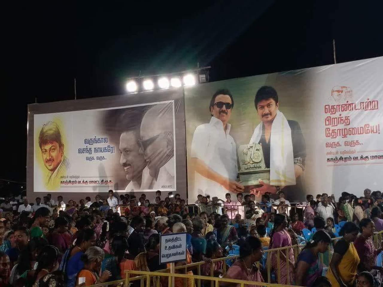 அதுவும் காஞ்சிபுரம் மாவட்டம் சார்பாக உதயநிதியை வாழ்த்தியும், வரவேற்றும் பிரமாண்டமான பிளக்ஸ் பேனர்கள் வைக்கப்பட்டிருந்தன. இதுநாள் வரை தி.மு.க சார்பில் வைக்கப்படும் பிளக்ஸ் பேனர்களில் உதயநிதி புகைப்படம் சிறிய அளவில் இடம் பெற்று இருக்கும். ஆனால் சென்னையில் உதயநிதி படத்தை பிரமாண்டமான அளவில் வைத்து பிளக்ஸ்கள் வைக்கப்பட்டிருந்தன. அதுவும் காஞ்சிபுரம் மாவட்ட தி.மு.க சார்பில் இந்த பிளக்ஸ்கள் வைக்கப்பட்டது தான் ஹைலைட்.