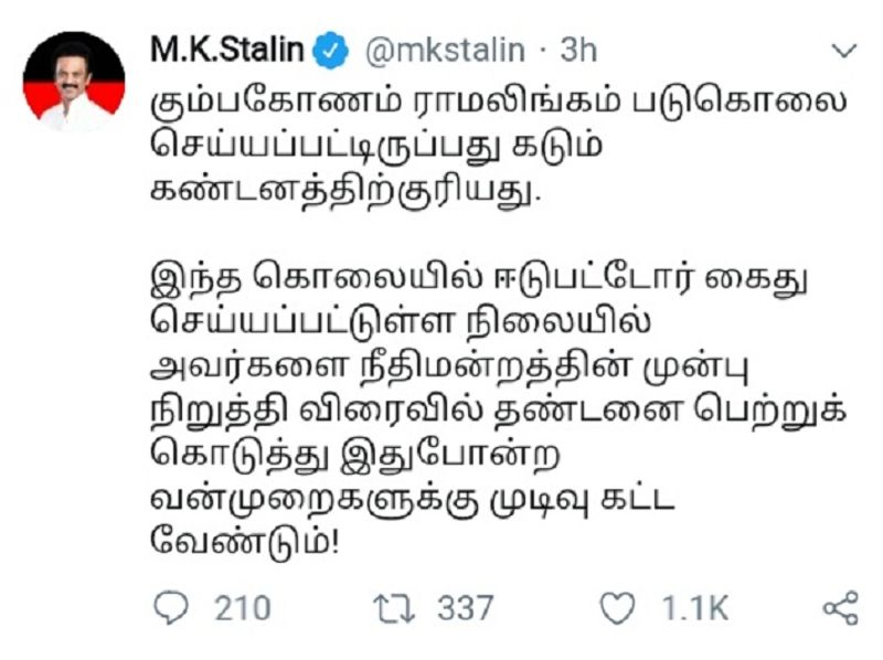 இந்நிலையில் . திமுக தலைவர் மு.க.ஸ்டாலின் தனது டுவிட்டரில், 'கும்பகோணம் ராமலிங்கம் படுகொலை செய்யப்பட்டிருப்பது கடும் கண்டனத்திற்குரியது. இந்த கொலையில் ஈடுபட்டோர் கைது செய்யப்பட்டுள்ள நிலையில் அவர்களை நீதிமன்றத்தின் முன்பு நிறுத்தி விரைவில் தண்டனை பெற்றுக் கொடுத்து இதுபோன்ற வன்முறைகளுக்கு முடிவு கட்ட வேண்டும்!