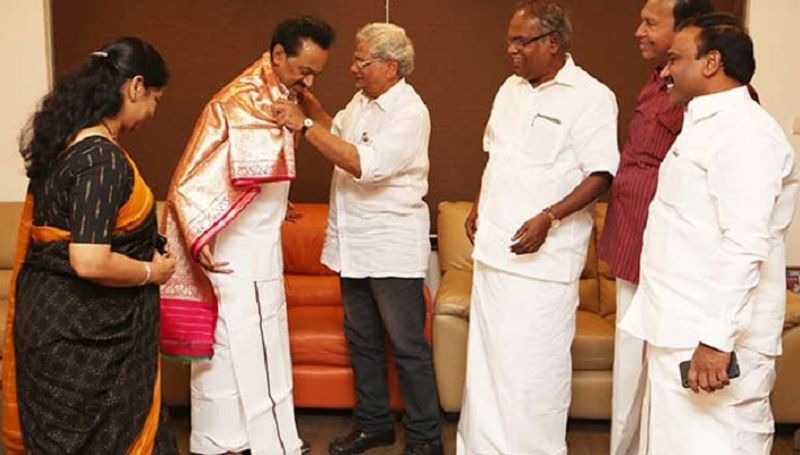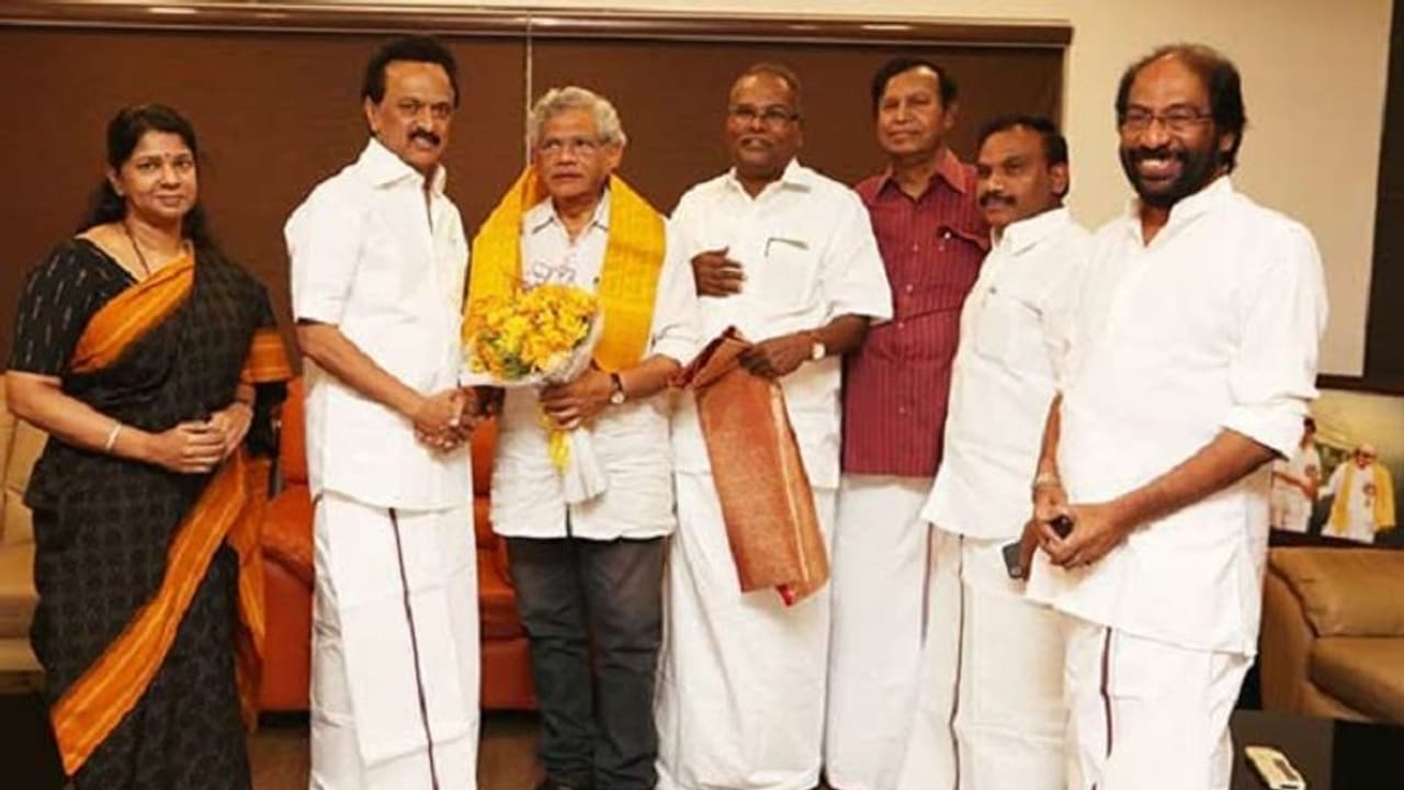 தமிழகத்தில்தி.மு.க.வுக்குமார்க்சிஸ்ட்கம்யூனிஸ்டுகட்சிஆதரவுஅளித்துவரும்நிலையில், அந்தகட்சியின்தேசியபொதுச்செயலாளர்சீதாராம்யெச்சூரிநேற்றுமாலைதி.மு.க. தலைவர்மு.க.ஸ்டாலினைசென்னைஆழ்வார்பேட்டையில்உள்ளஅவரதுஇல்லத்தில்சந்தித்துபேசினார்.
