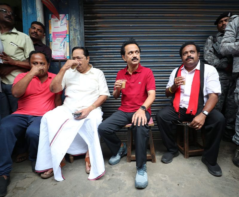 தொடர்ந்து பேருந்தில் பயணம் செய்தவர்கள், ஆட்டோவில் பயணம் செய்தவர்கள், துப்புரவுத் தொழிலாளர்கள் உள்ளிட்டோரை சந்தித்து ஆதரவு திரட்டினார். ஒரு கட்டத்தில் ஸ்டாலின், துரை முருகன் மற்றும் வேட்பாளர் கதிர் ஆனந்த் ஆகியோர் தெருவோர கடையில் டீ அருந்தியபடி வாக்கு சேகரித்தனர்.
