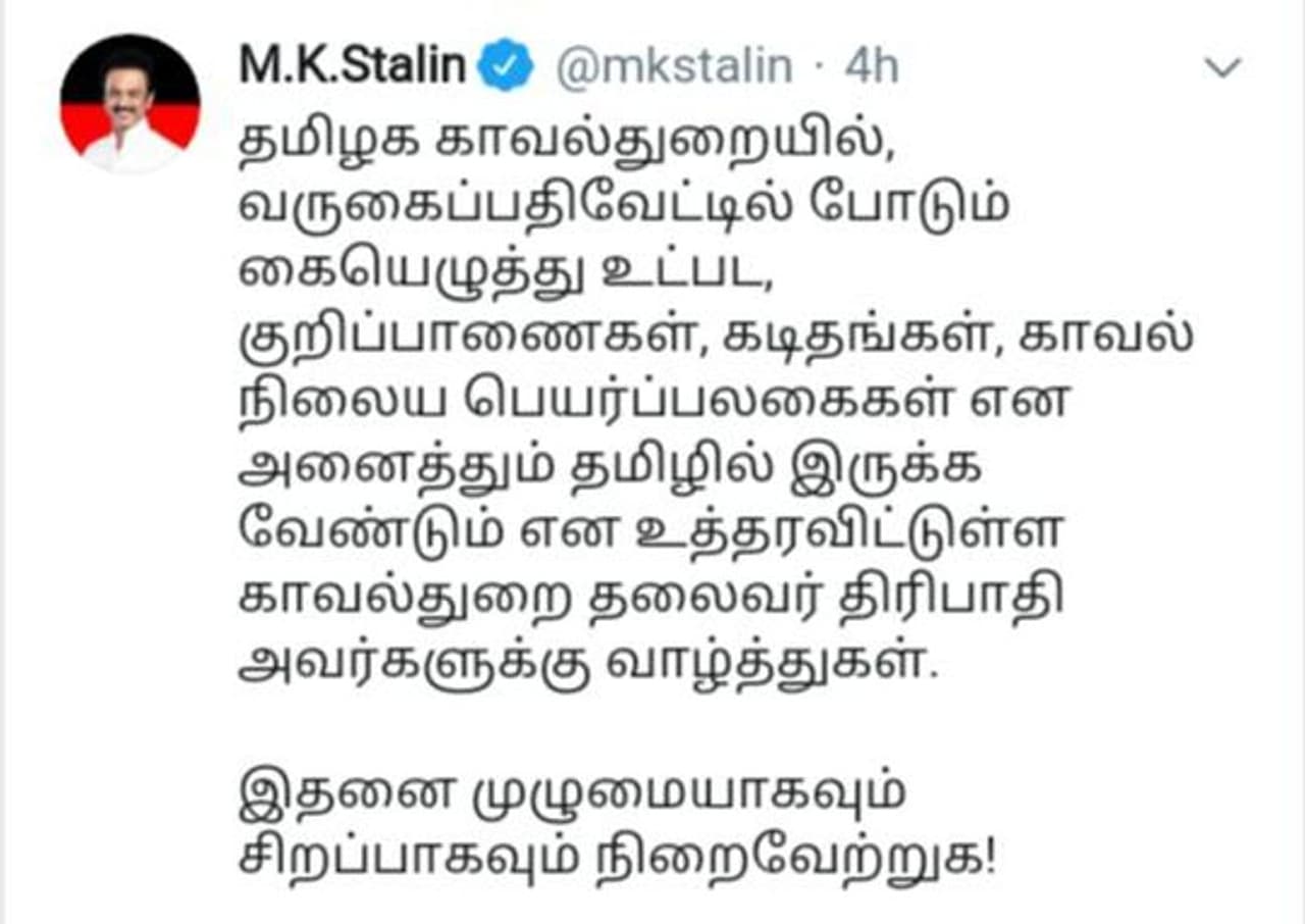 தமிழக காவல்துறையில் அனைத்தும் தமிழில் இருக்க வேண்டும் என டிஜிபி ஜெ.கே திரிபாதி பிறப்பித்த உத்தரவுக்கு மு.க. ஸ்டாலின் வாழ்த்து தெரிவித்துள்ளார்.