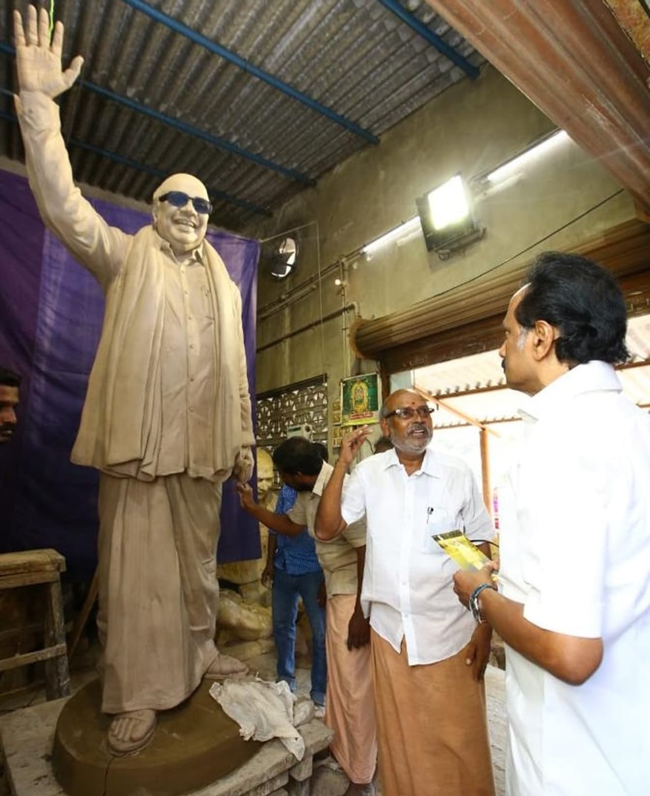 தி.மு.க.வின் தலைமை கழகமான அண்ணா அறிவாலயத்தில் மறைந்த கருணாநிதிக்கு சிலை வைக்கப்பட இருக்கிறது. இதற்காக திருவள்ளூர் மாவட்டம் மீஞ்சூரில் சிற்பி தீனதயாளன் என்பவர் கருணாநிதியின் முழு உருவ சிலையை வடித்து வருகிறார். இதை இன்று ஸ்டாலின் நேரில் சென்று பார்த்து ‘அப்படியே அப்பா நேர்ல நின்ன மாதிரியே இருக்குது!’ என்று நெகிழ்வாய் பிரமித்திருக்கிறார்.