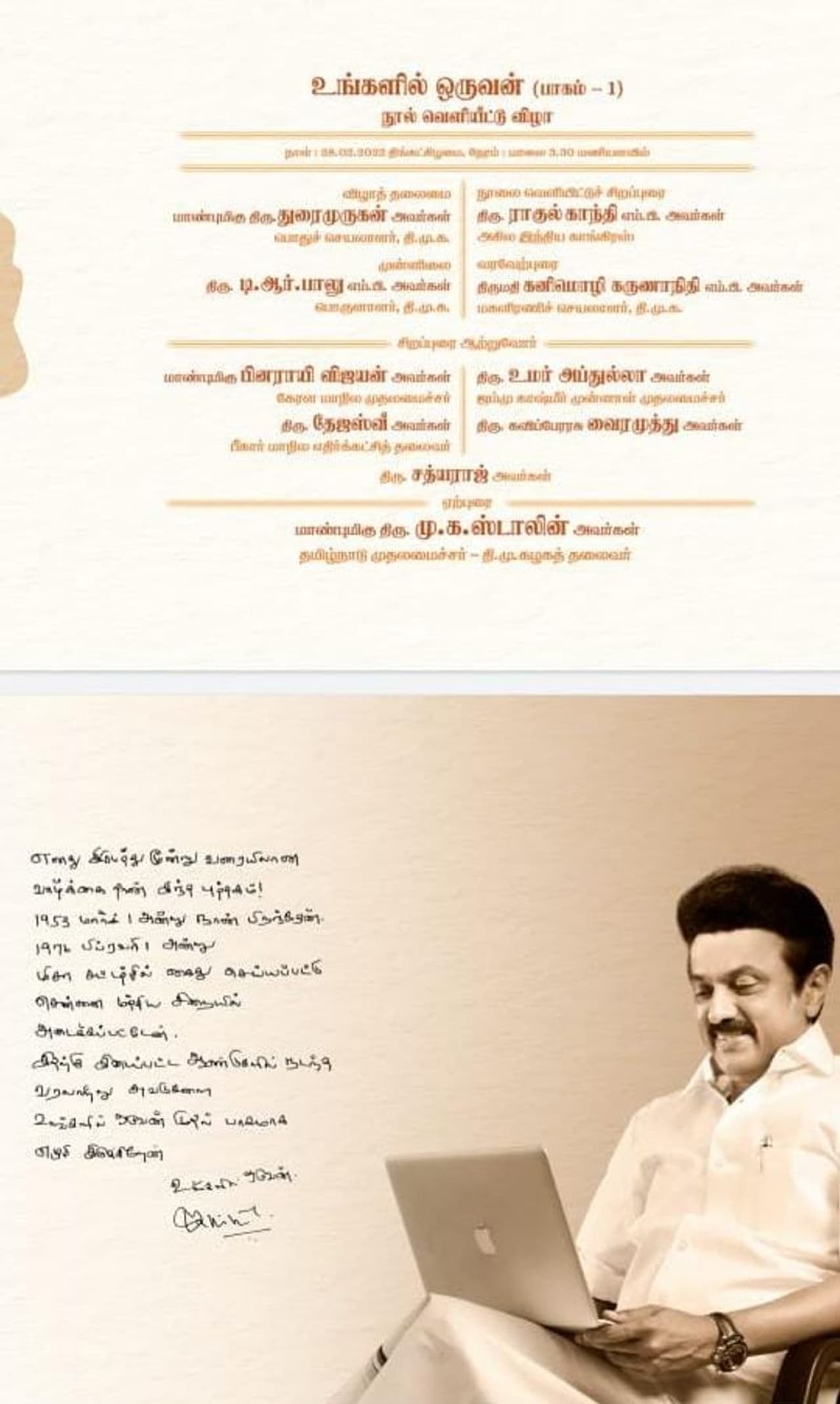இந்த புத்தகத்தை வருகிற 28 ஆம் தேதி ராகுல்காந்தி வெளியிடவுள்ளார். இந்த நிகழ்ச்சியில் கேரள முதலமைச்சர் பினராயி விஜயன் காஷ்மீர் முன்னாள் முதல்வர் உமர் அப்துல்லா பிகார் மாநில எதிர்க்கட்சித் தலைவர் தேஜஸ்வி உள்ளிட்டோர் கலந்து கொள்கின்றனர்.இந்த புத்தகத்தில் வெளியில் தெரியாத பல விஷயங்கள் இடம்பெற்றுள்ளதாக கூறப்படுகிறது. புத்தகங்களின் வெளியீட்டிற்காக உடன்பிறப்புகள் மட்டும் இல்லாமல் ஏராளமான பொதுமக்களும் காத்துக் கொண்டுள்ளனர்.