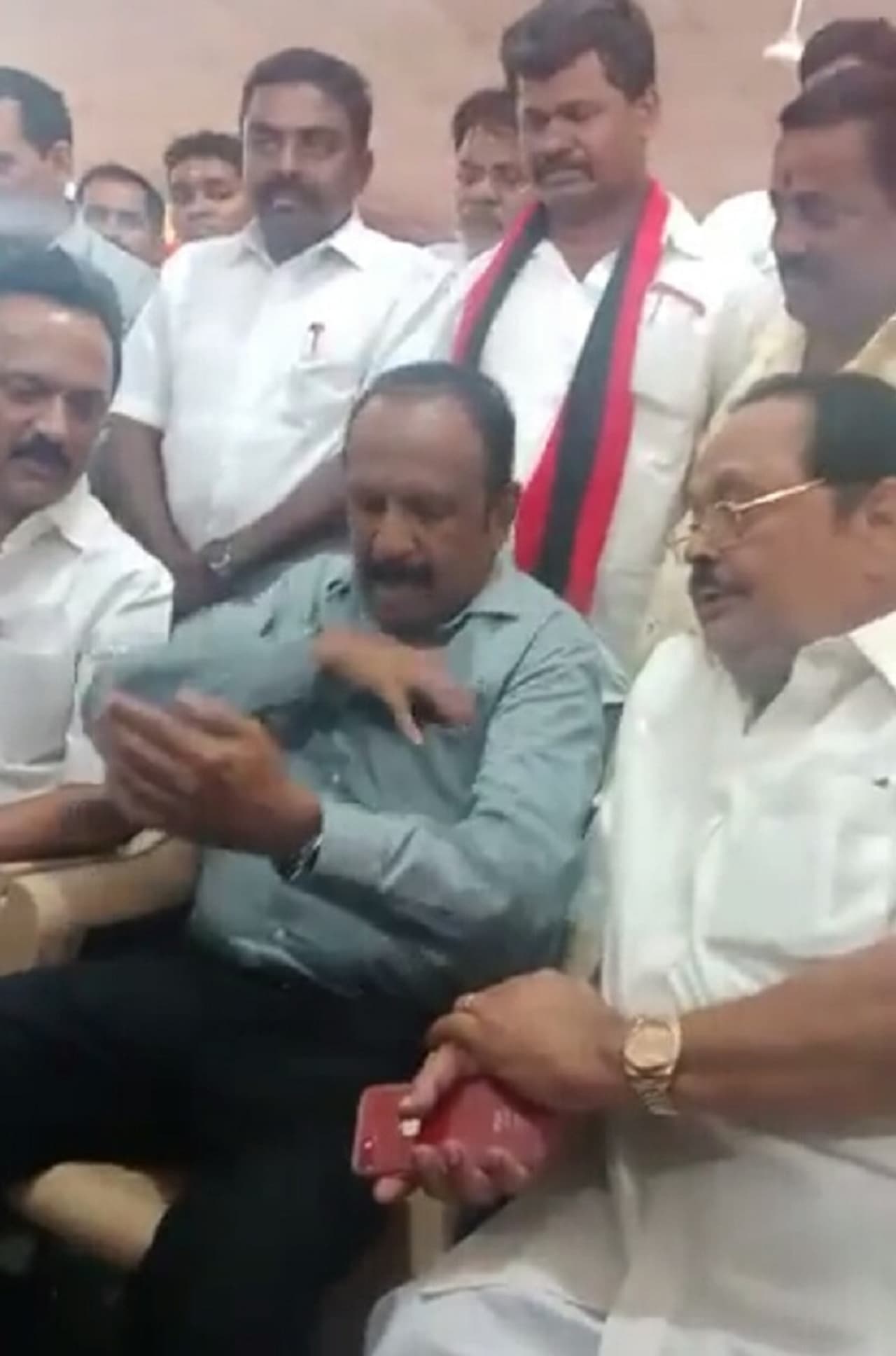 அப்போது வைகோ அவரை சந்திக்க வந்த தலைவர்களை அவ்வப்பொழுது எழுந்து நின்று, எழுந்து நின்று வரவேற்றதால் கடுப்பான துரை முருகன் யோவ் உட்காருய்யா !! கல்யாண வூடாட்டம்… எல்லோரையும் வா. வா.. கூப்பிட்டுக்கிட்டு என கலாய்த்ததால் அந்த இடமே கலகலப்பானது.
