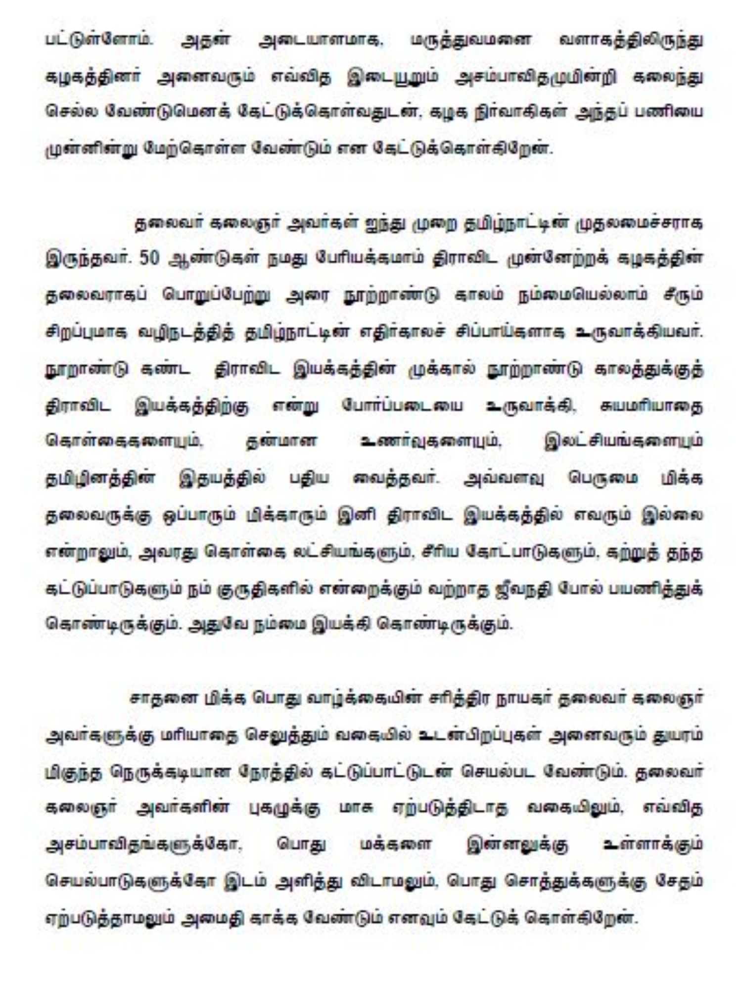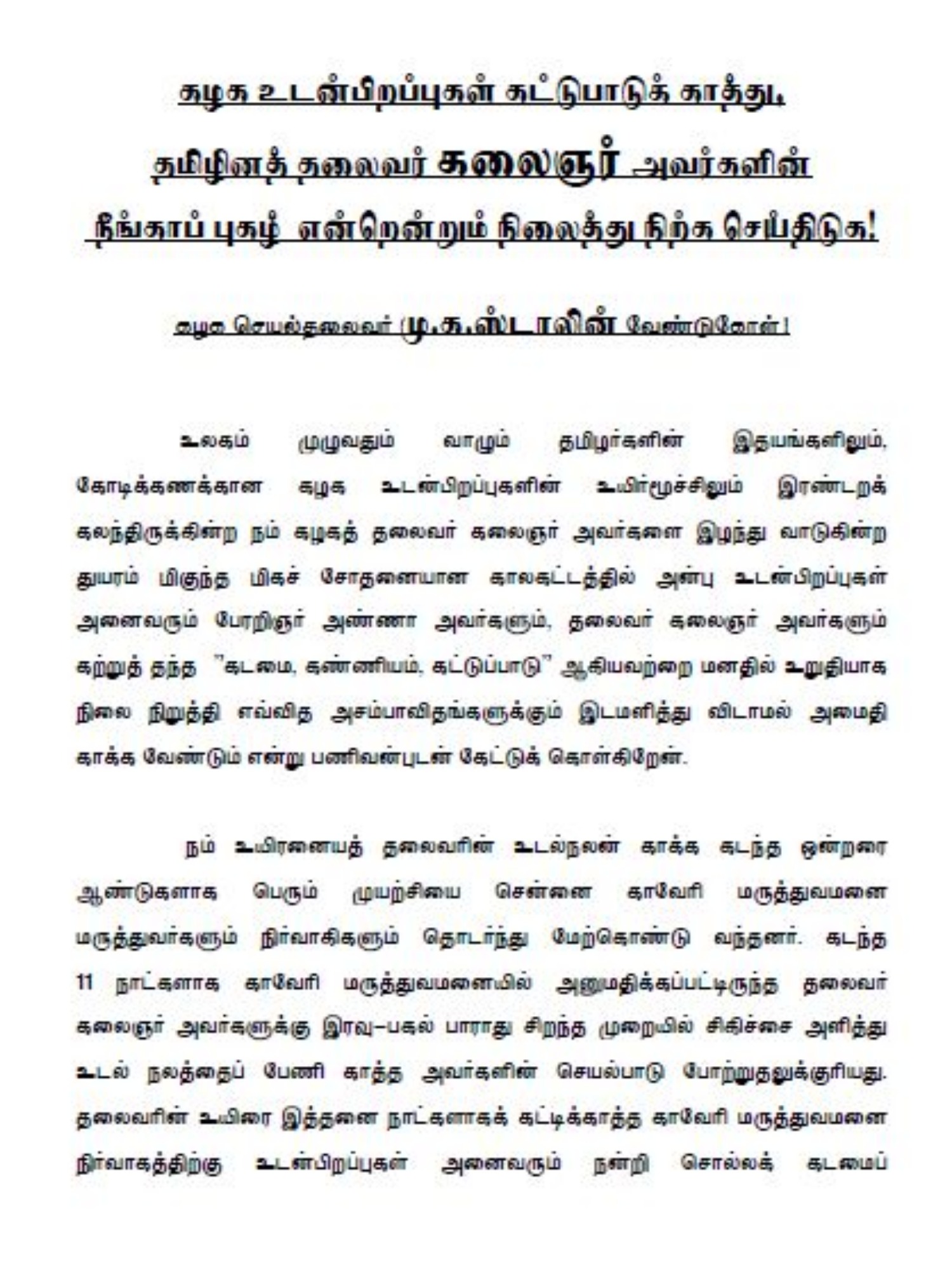 தொண்டர்கள் கட்டுப்பாடோடு இருக்க வேண்டும் என ஸ்டாலின் கண்ணீரோடு அறிக்கை விடுத்து உள்ளார்.
