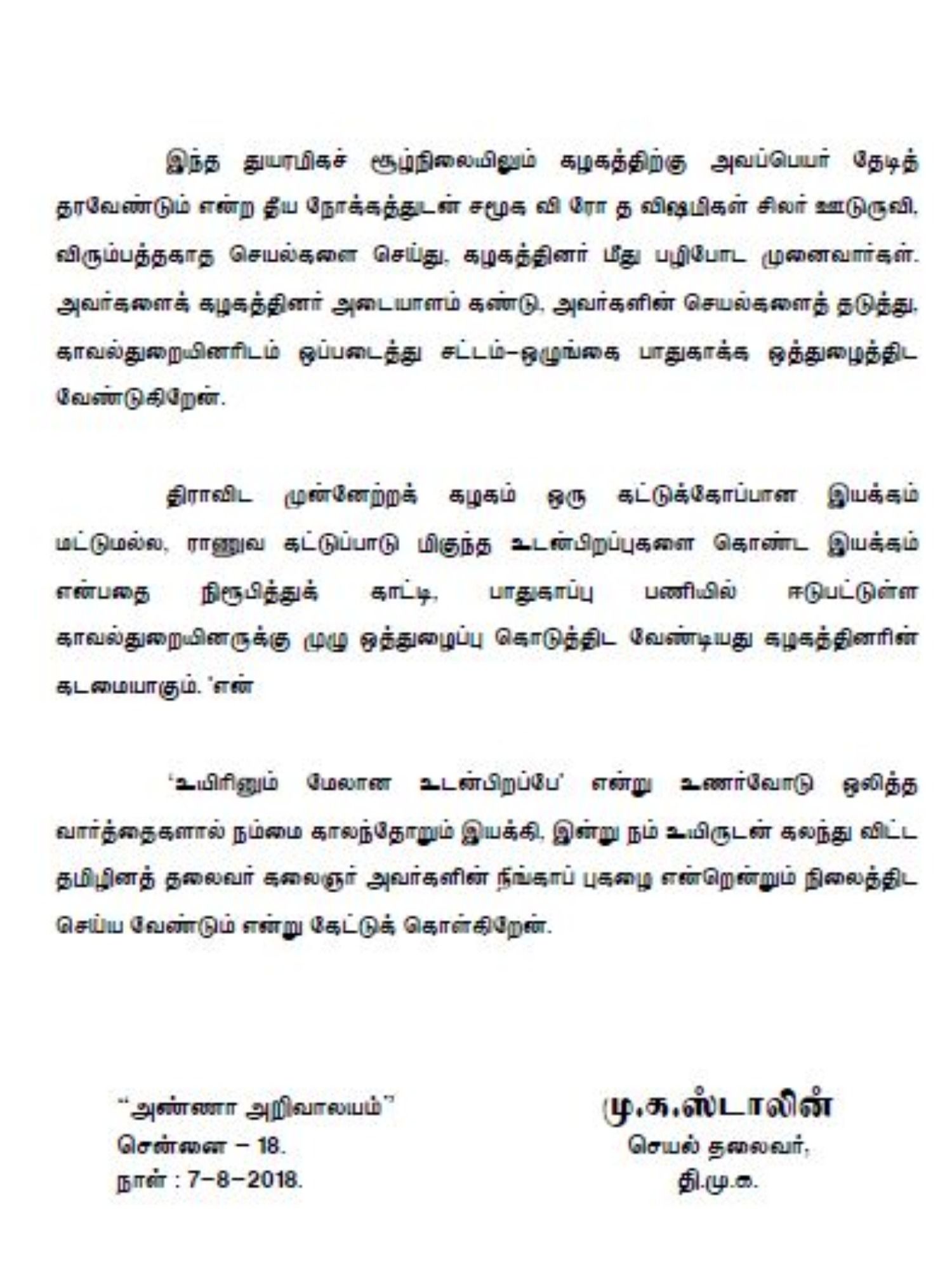 திமுக தலைவர் கருணாநிதி மறைவை அடுத்து , தனது தொண்டர்கள் கட்டுப்பாடோடு இருக்க வேண்டும் என திமுக செயல் தலைவர் ஸ்டாலின் அறிக்கை விடுத்து உள்ளார்