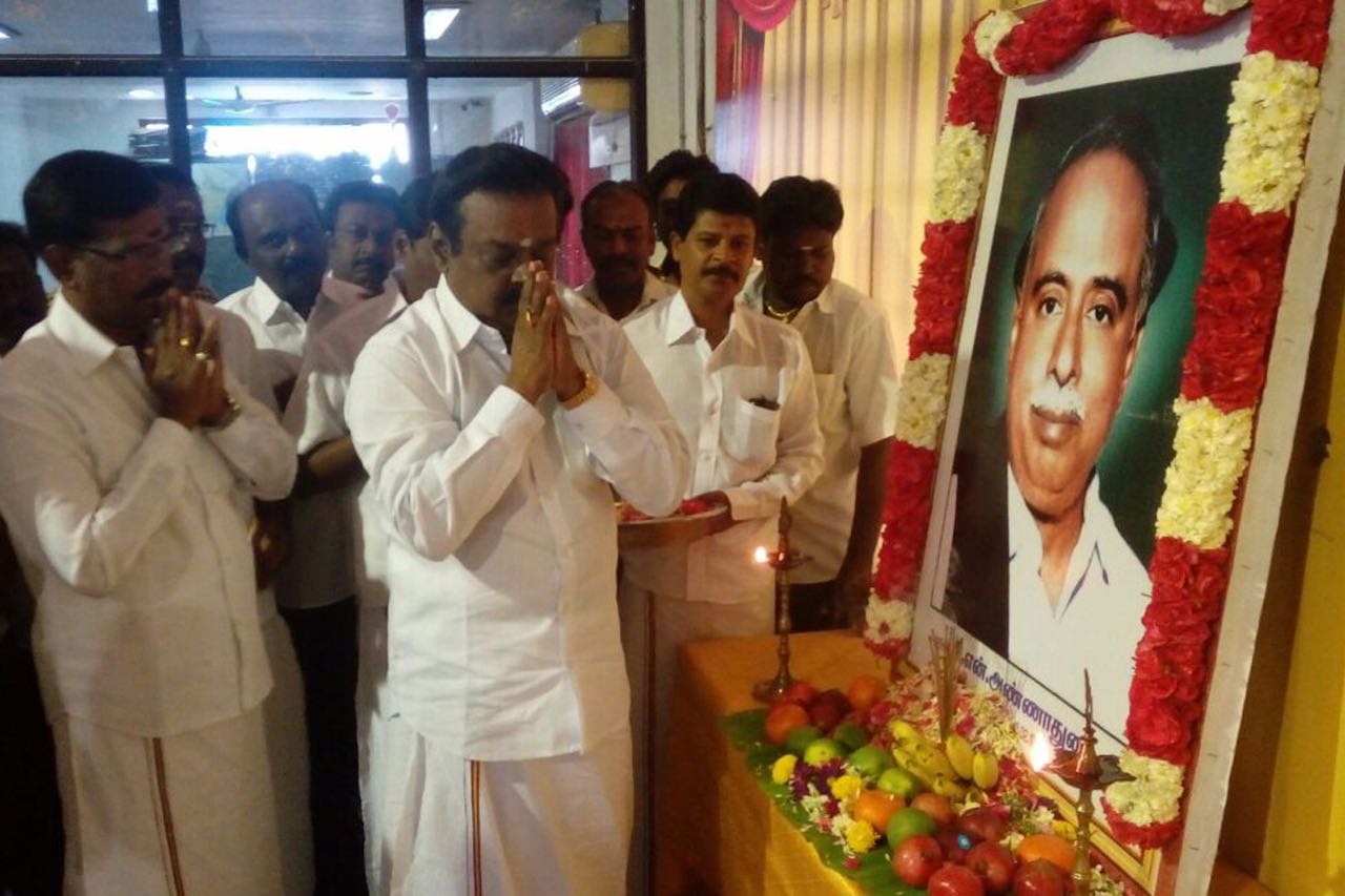 சென்னை கோயம்பேட்டில் உள்ள தேமுதிக அலுவலகத்தில் அக்கட்சி தலைவர் விஜயகாந்த், அண்ணா படத்துக்கு மலர் தூவி அஞ்சலி செலுத்தினார்.