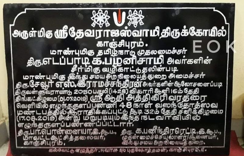 அதில் தமிழக முதல்வர் எடப்பாடி கே.பழனிசாமி பெயரும் இடம்பெற்றுள்ளது. இதன்மூலம் அத்திவரதரின் வரலாற்றில் எடப்பாடி கே.பழனிசாமியும் ஒரு அங்கமாக இடம்பிடித்துள்ளார். அவரது பெயௌடன் இந்து சமய அறநிலையதுறை அமைச்சர் சேவூர் ராமச்சந்ந்திரன், கலெக்டர் பொன்னையா ஆகியோரது பெயரும் இடம்பெற்றுள்ளது.