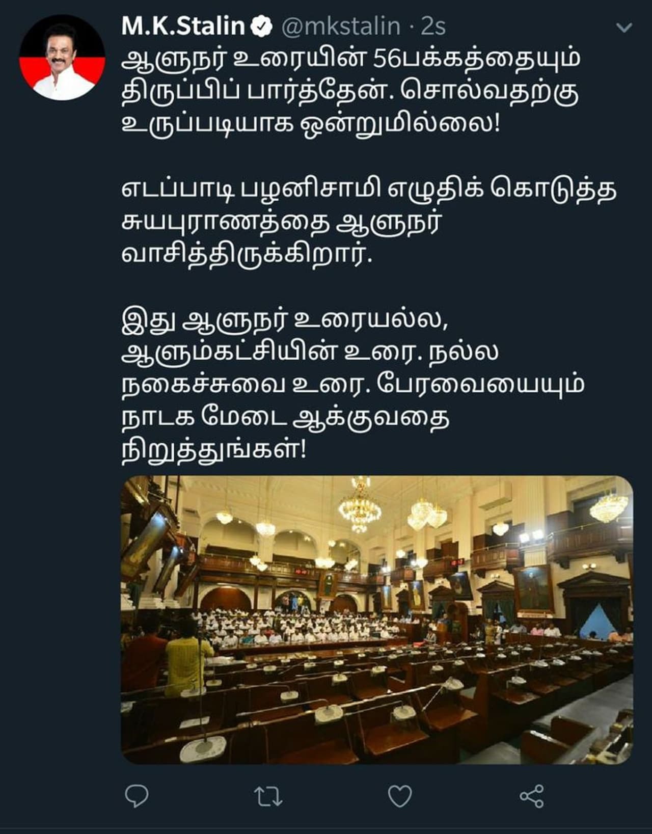 இந்நிலையில் ஆளுநர் உரை குறித்து ஸ்டாலின் தனது டுவிட்டர் பதிவில், “ஆளுநர் உரையின் 56பக்கத்தையும் திருப்பிப் பார்த்தேன். சொல்வதற்கு உருப்படியாக ஒன்றுமில்லை, எடப்பாடி பழனிசாமி எழுதிக் கொடுத்த சுயபுராணத்தை ஆளுநர் வாசித்திருக்கிறார்.